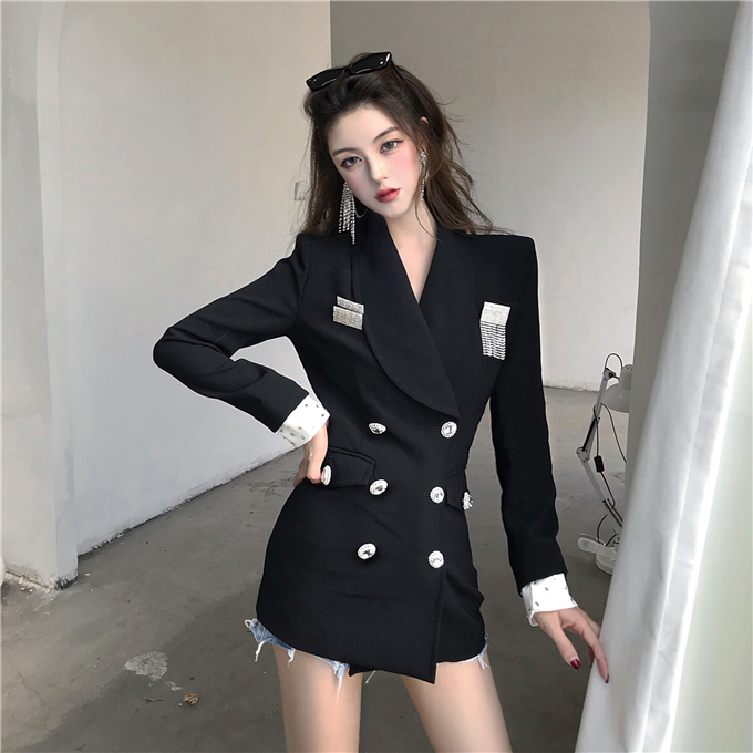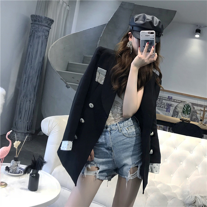 / 黑色亮鉆雙排扣小香風新款韓版修身顯瘦百搭長袖西裝外套女配胸針