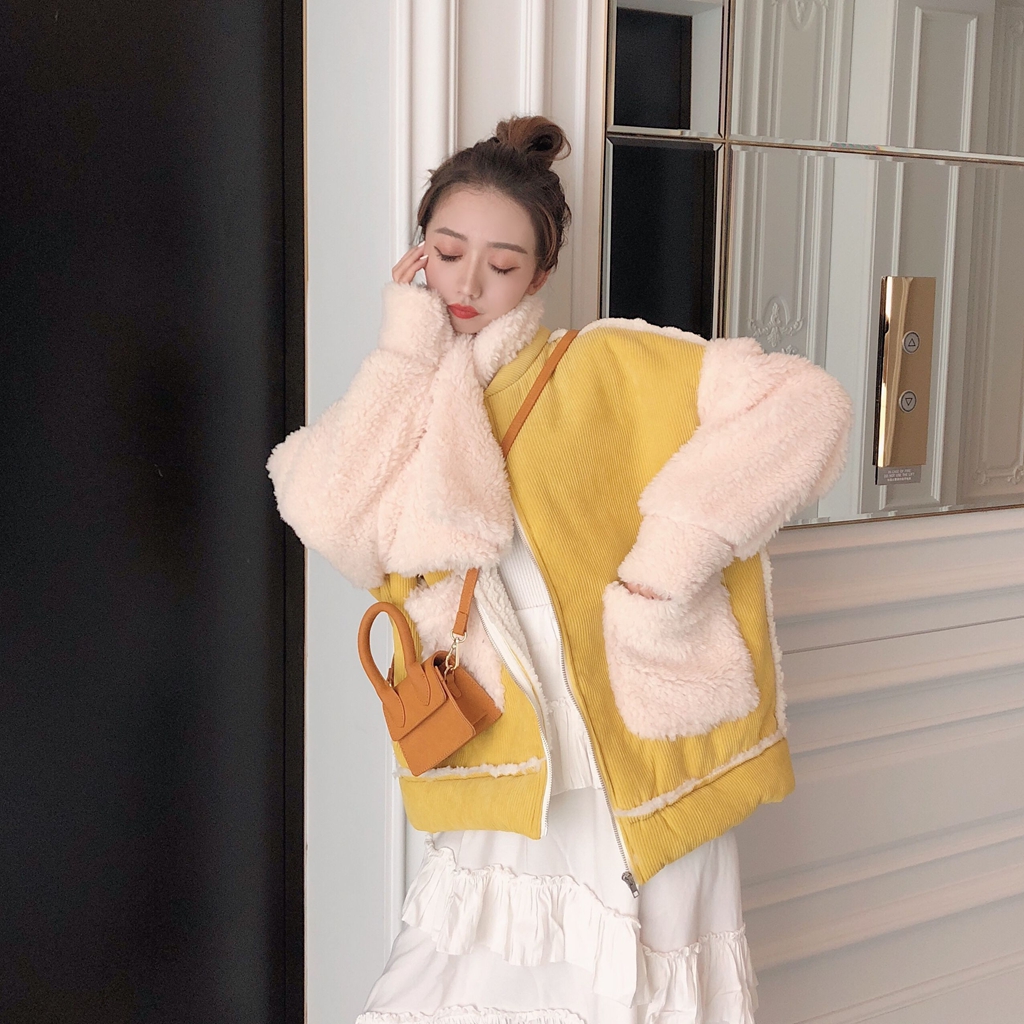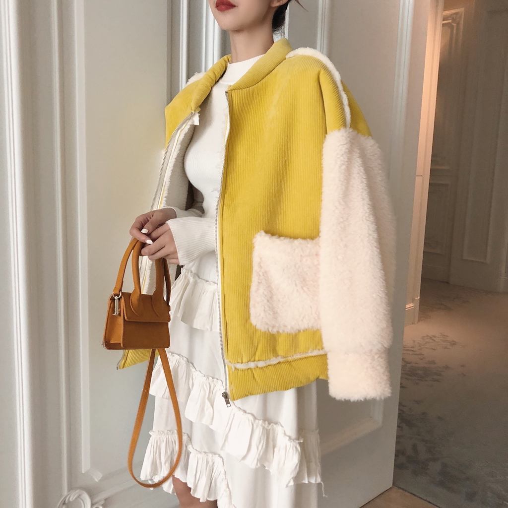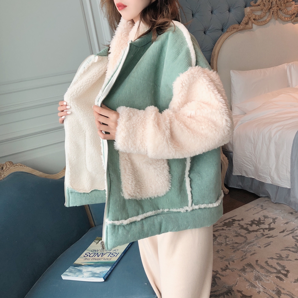 韓版時尚chic百搭仿羊羔毛拼接燈芯絨加厚外套女冬季2018新款棉衣