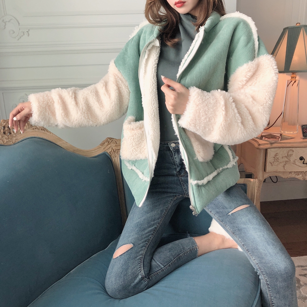 / 韓版時尚chic百搭仿羊羔毛拼接燈芯絨加厚外套女冬季2018新款棉衣