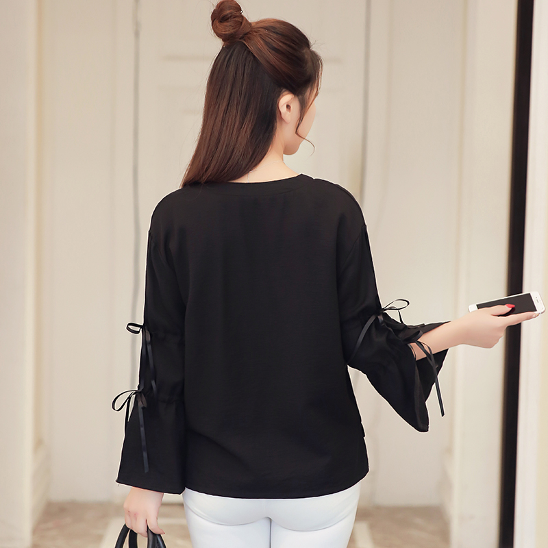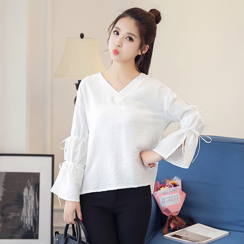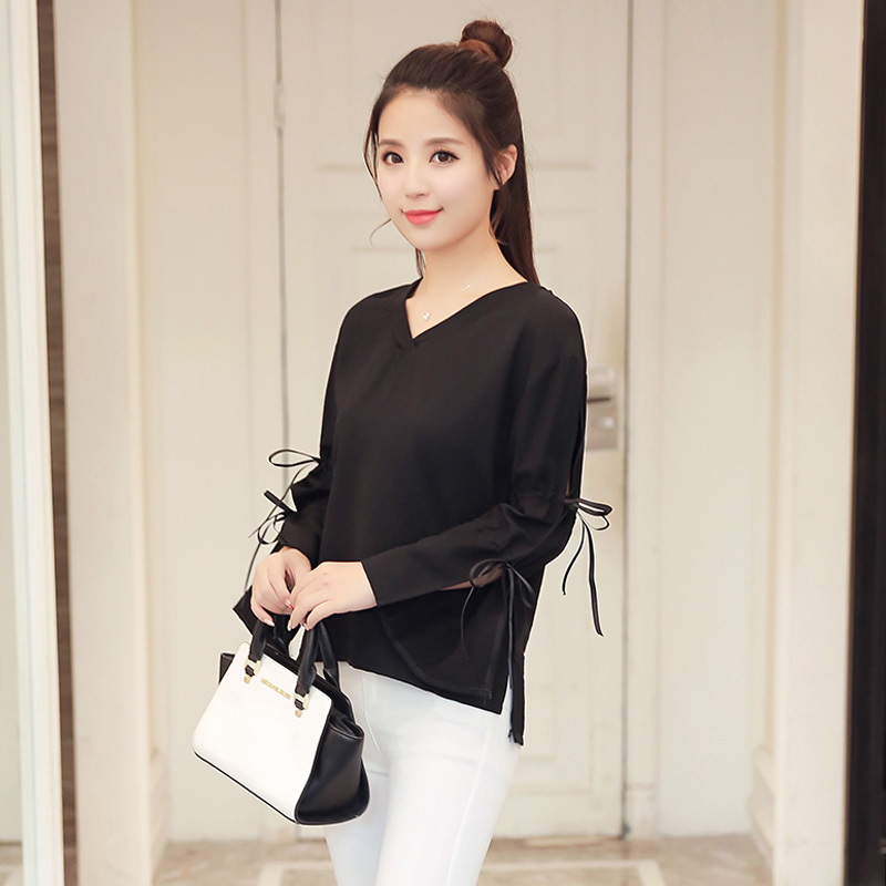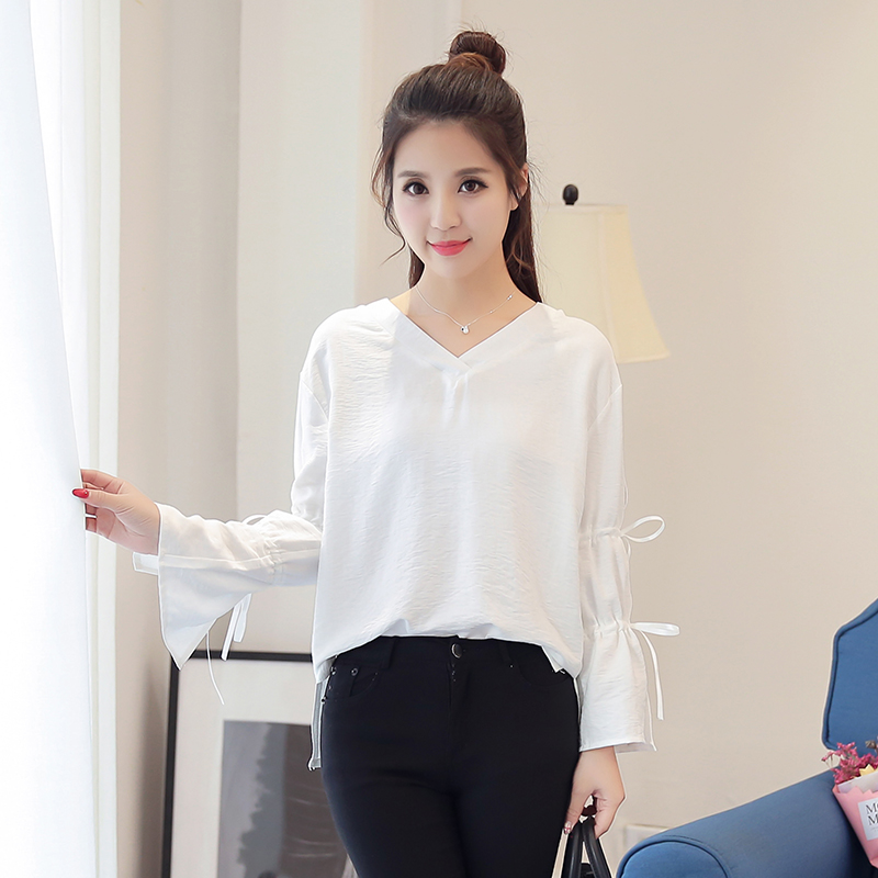 / 白襯衫女長袖春裝新款韓范百搭V領寬松蝴蝶結系帶雪紡衫上衣
