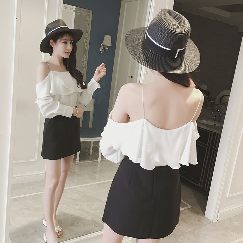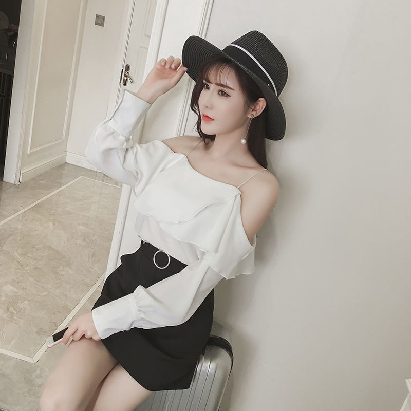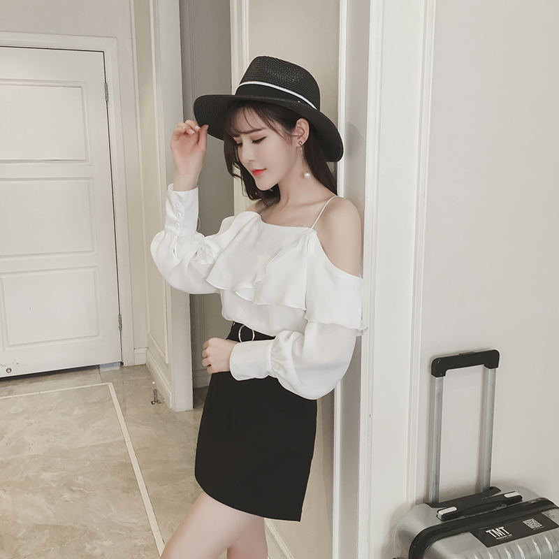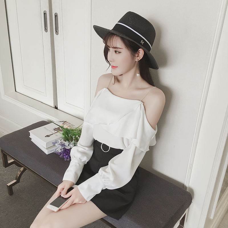 / 春夏新款女裝韓版一字領露肩荷葉邊吊帶雪紡衫女士燈籠袖露背上衣