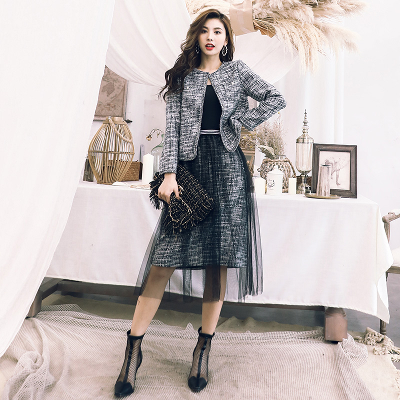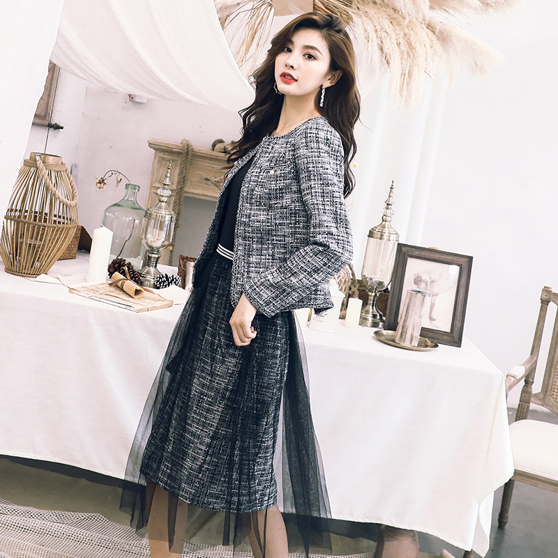 / 初秋兩件套女2018新款圓領外套網紗拼接半身裙氣質港風時尚套裝潮