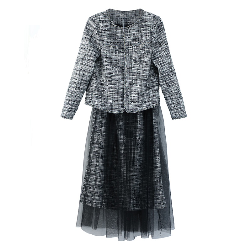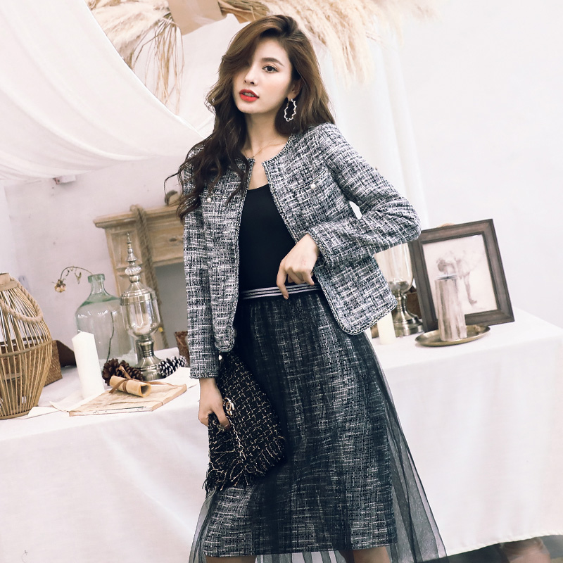 初秋兩件套女2018新款圓領外套網紗拼接半身裙氣質港風時尚套裝潮