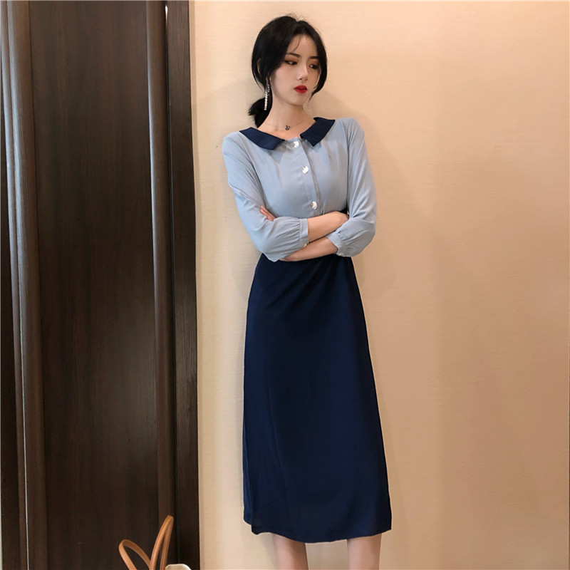 chic早秋裙子長裙女慵懶風韓版百搭娃娃領絲絨蕾絲顯瘦長袖連衣裙
