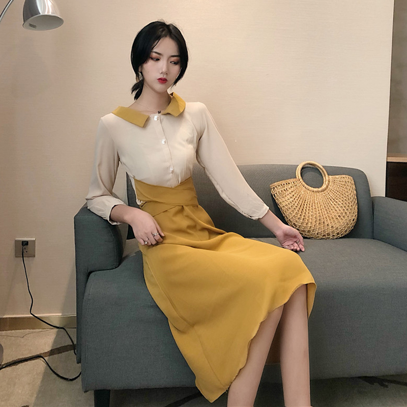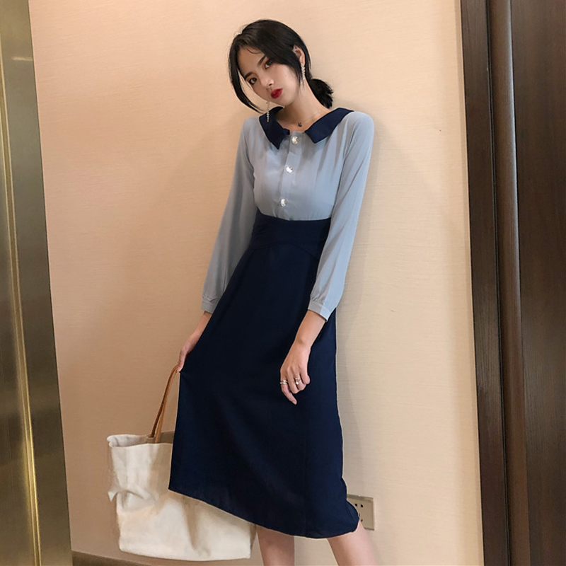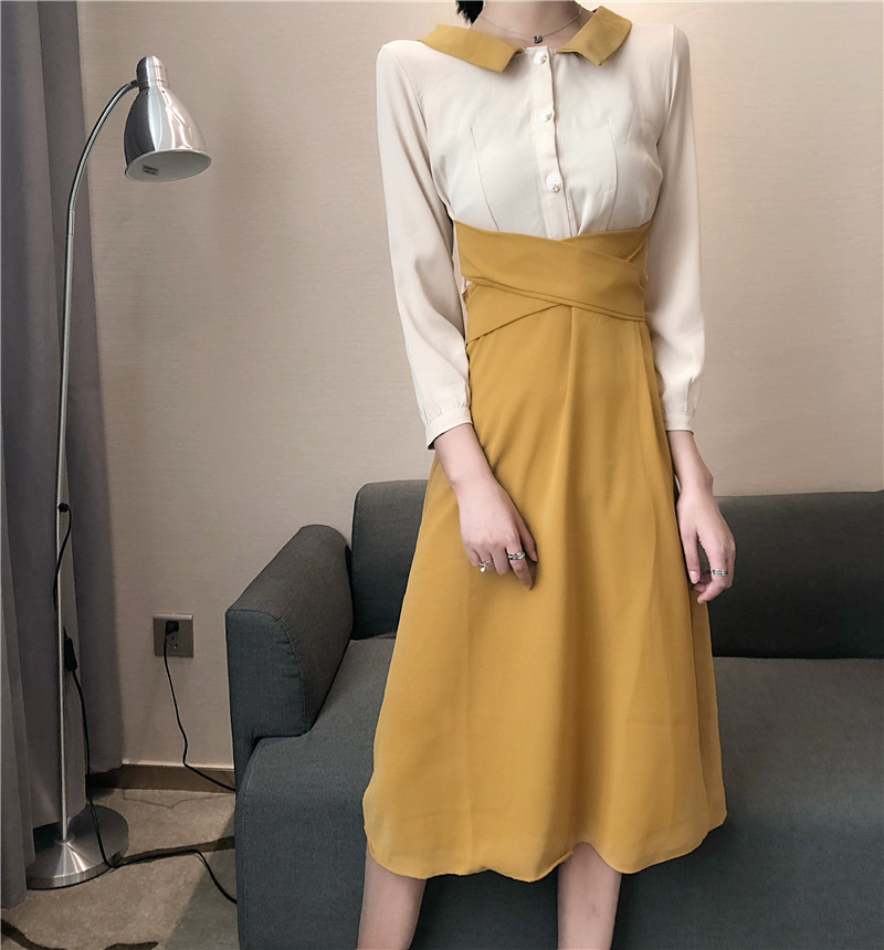 秋裝女2018新款時尚港味氣質復古拼色綁帶法式少女中長款連衣裙潮