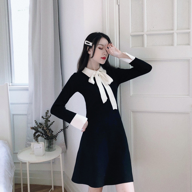 / 港味特色女裝秋2018新款女綁蝴蝶結設計韓版氣質顯瘦針織連衣裙女