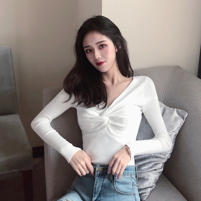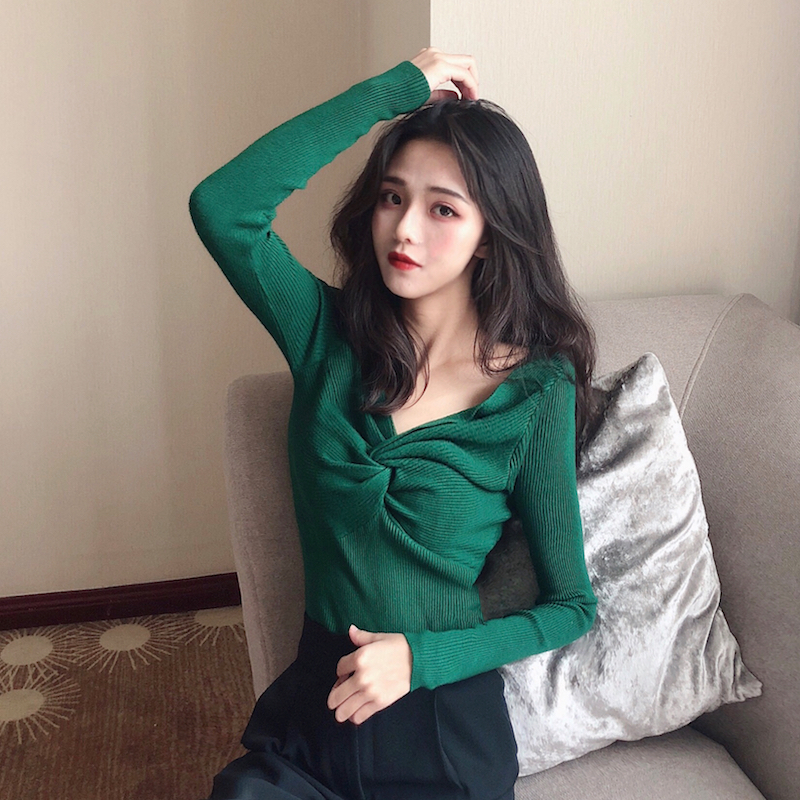 秋冬網紅毛衣女2018新款針織衫女長袖交叉紐結純色打底衫修身上衣