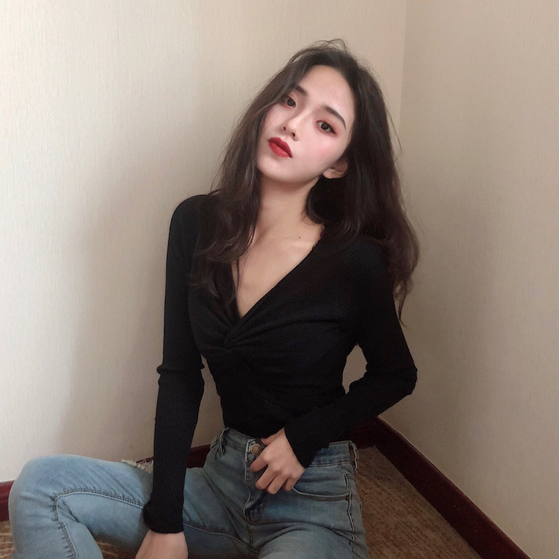 初秋溫柔風毛衣女長袖紐結針織衫韓版港味交叉純色打底衫修身毛衣