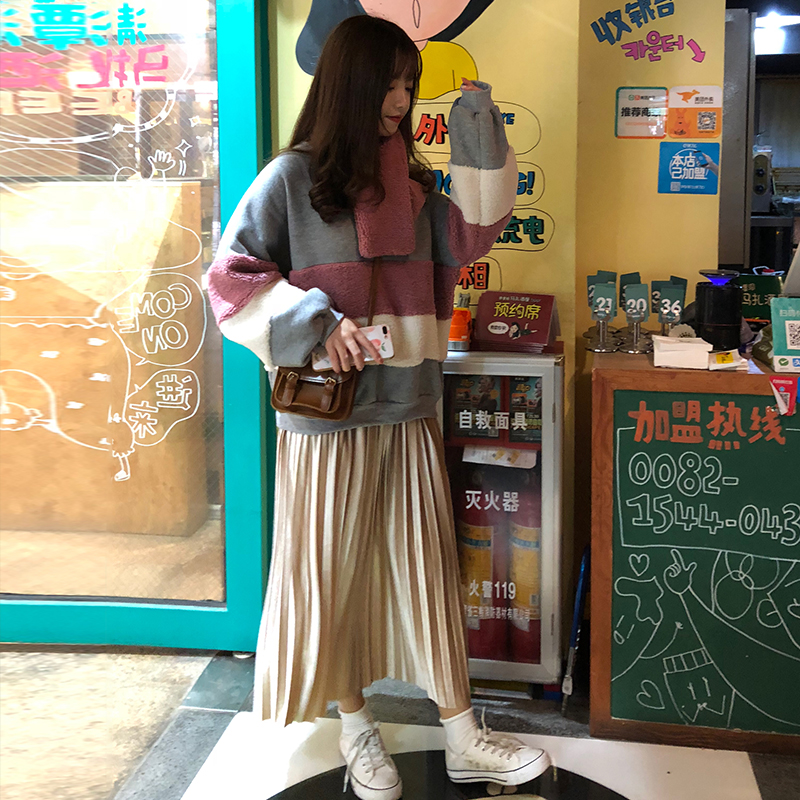 / 可可里小姐~時尚休閑仿羊羔毛拼接加絨衛衣+絲絨半身裙