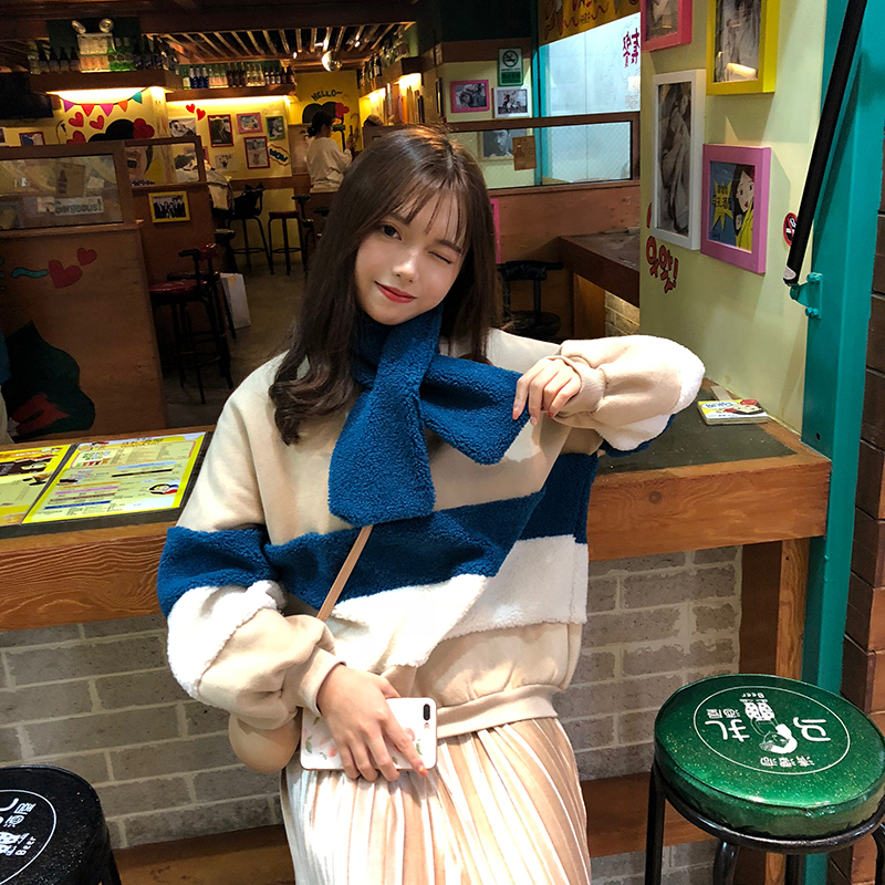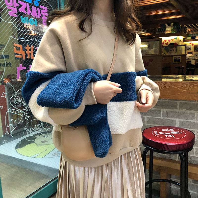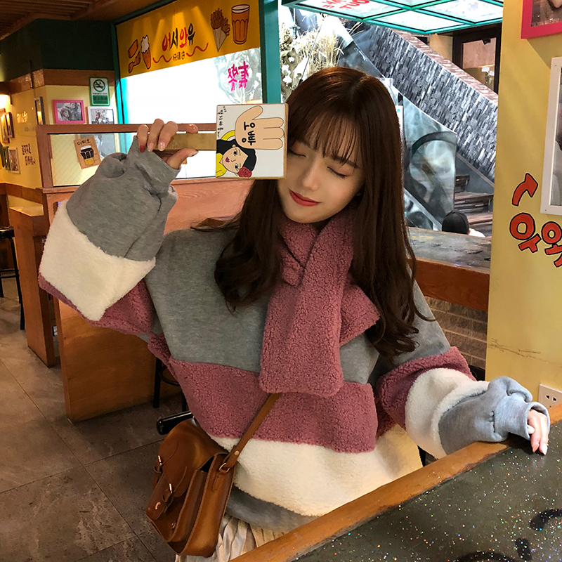 可可里小姐~時尚休閑仿羊羔毛拼接加絨衛衣+絲絨半身裙