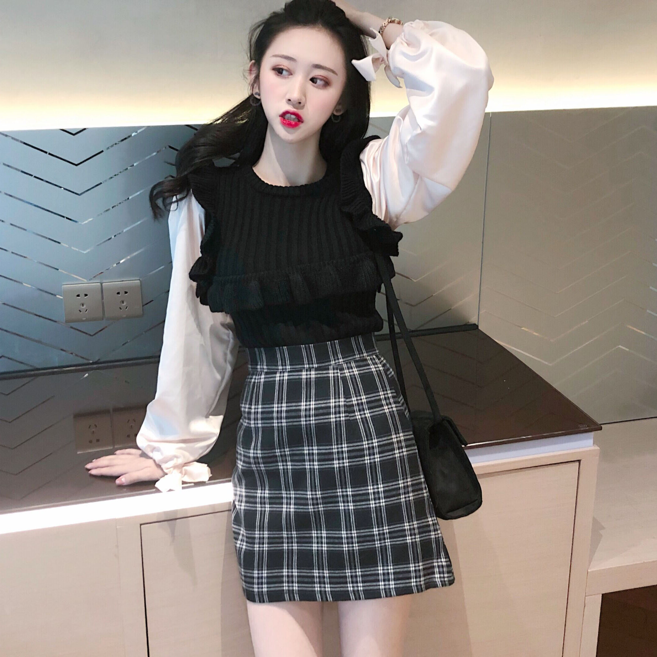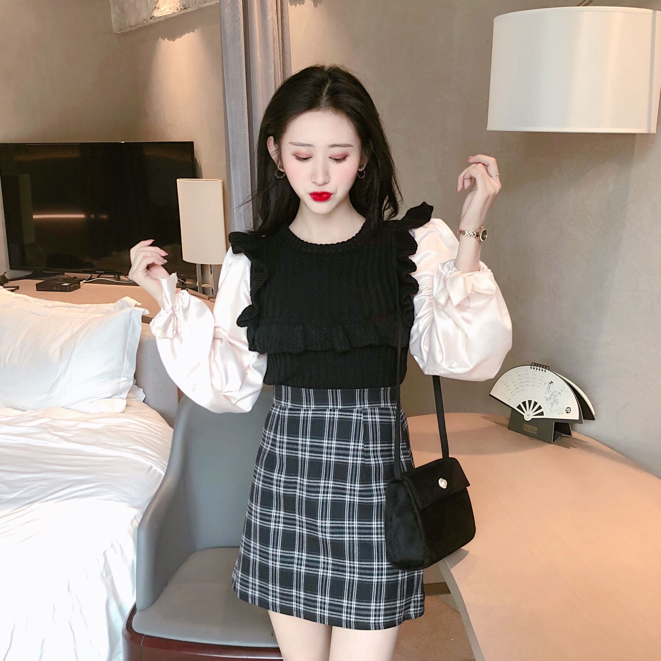 網紅款2018新款秋慵懶風毛衣女長袖拼接荷葉邊圓領假兩件針織衫潮