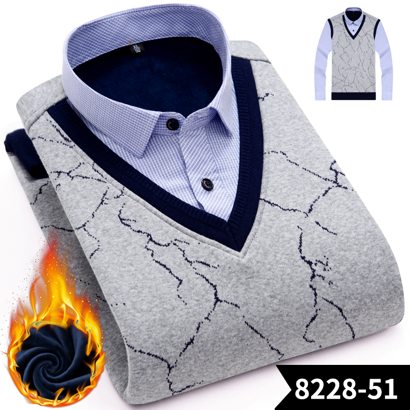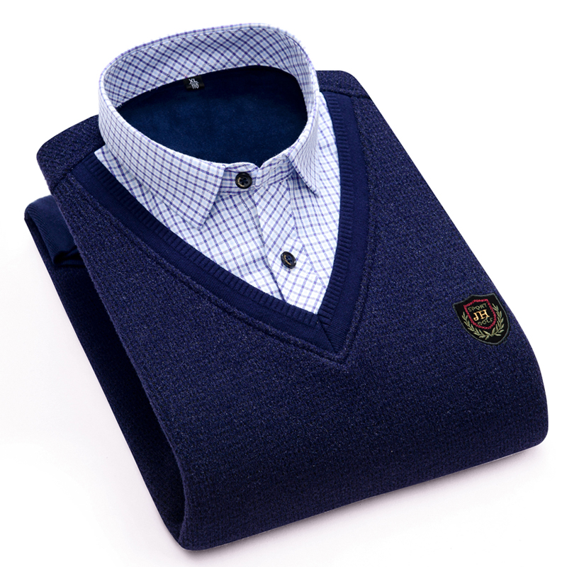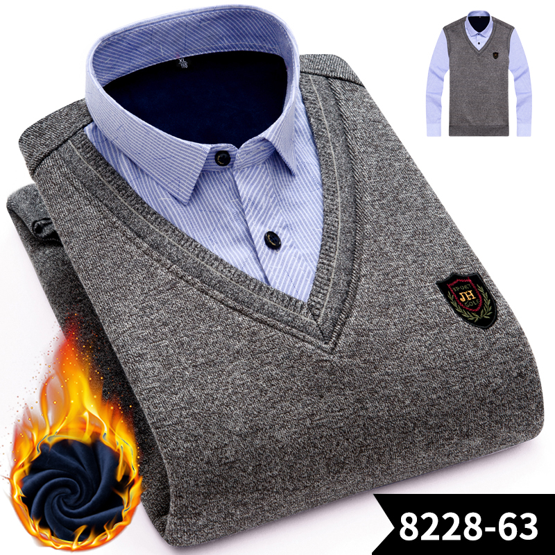 冬季假兩件保暖襯衫男加絨加厚休閑中年爸爸保暖襯衣套頭保暖上衣