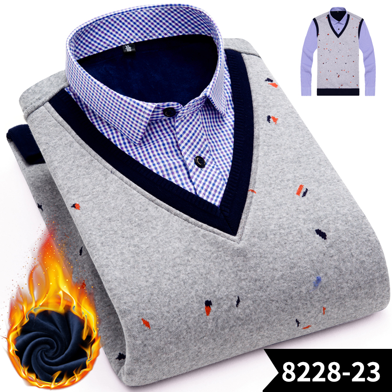 / 冬季假兩件保暖襯衫男加絨加厚休閑中年爸爸保暖襯衣套頭保暖上衣