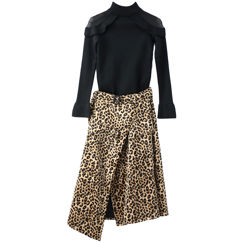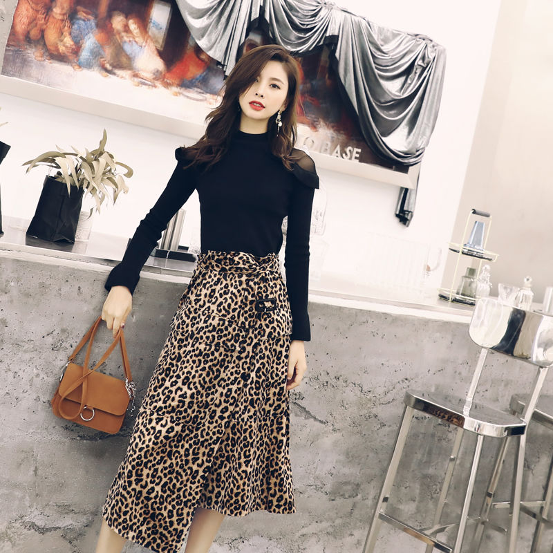裙子女2018新款不規則半身裙高腰秋冬豹紋百搭中裙時尚針織衫套裝