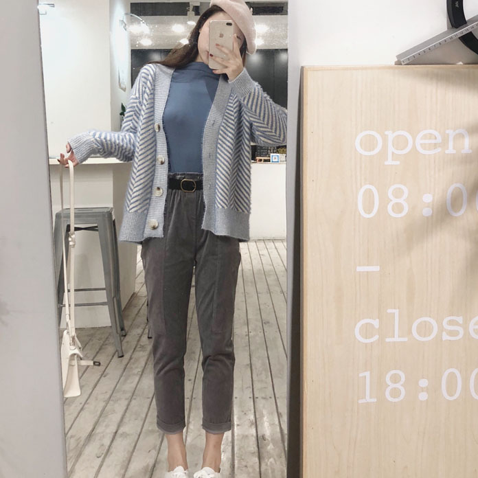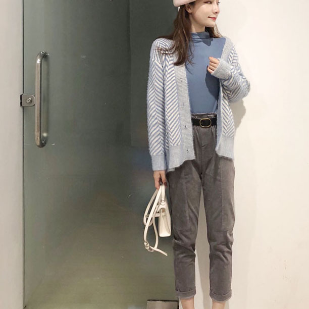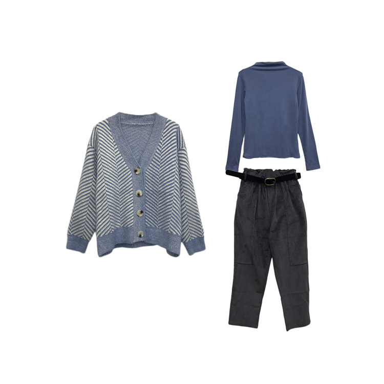 藍色打底T恤|灰色休閑褲送腰帶|藍色毛衣開衫