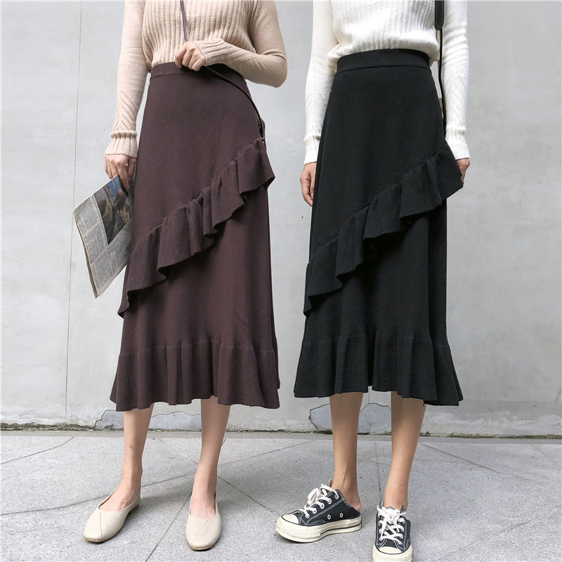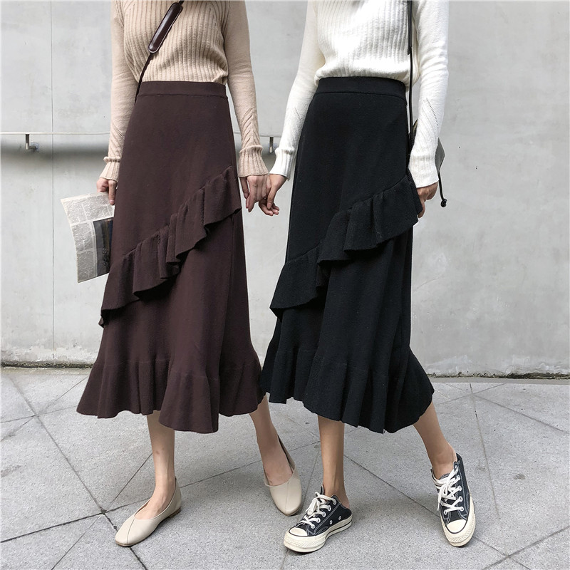 / 港味時尚百搭A字裙秋季新款韓版chic針織高腰中長款荷葉邊半身裙