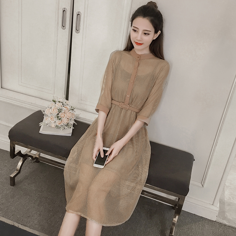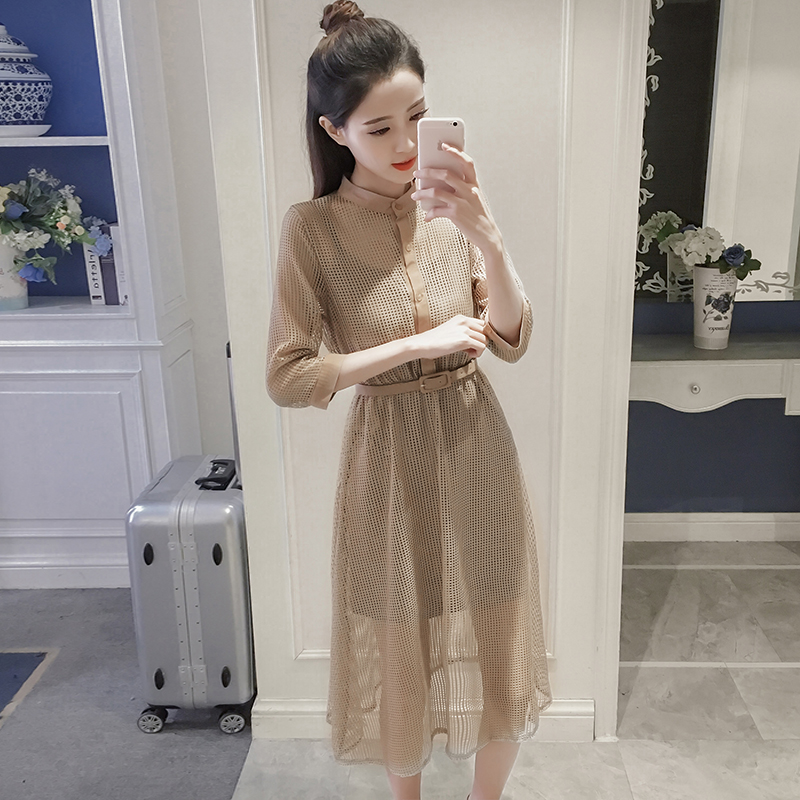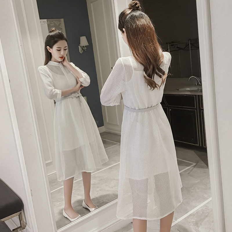 / 春夏季新款女裝韓版中長款修身顯瘦七分袖網紗襯衫連衣裙套裝