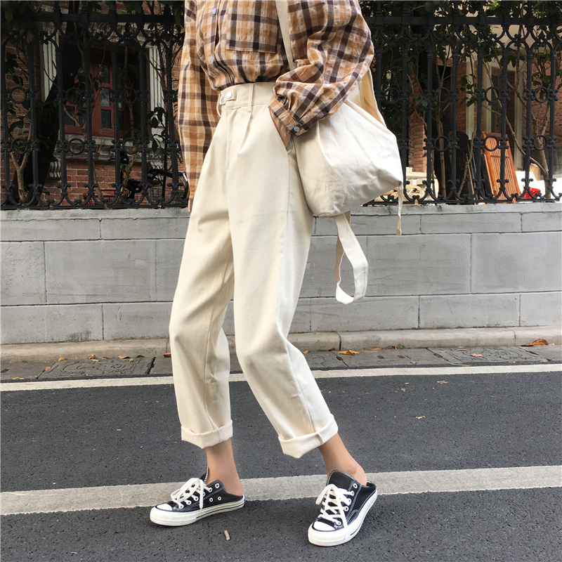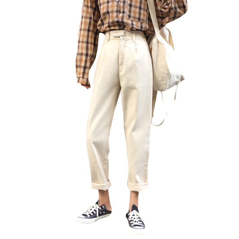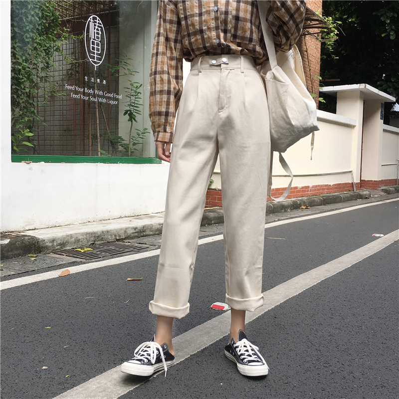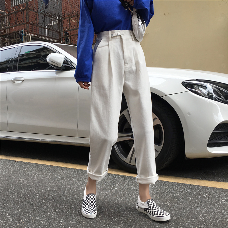 / 2018新款秋冬韓版松緊腰兩粒扣高腰寬松直筒褲牛仔褲闊腿褲學生女