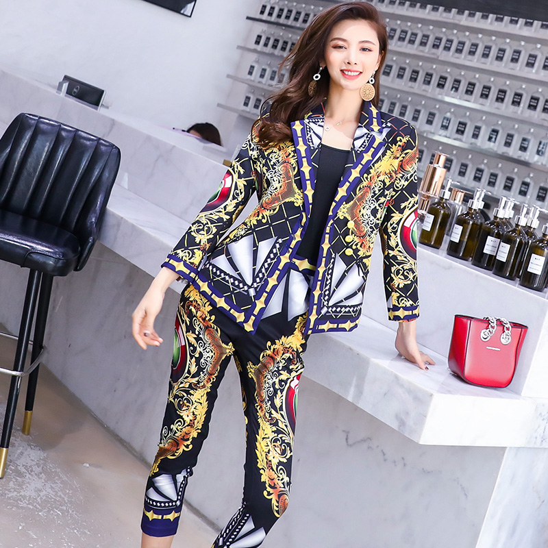 歐美范印花西裝套裝2018長袖小西服修身七分褲職業套裝網紅兩件套