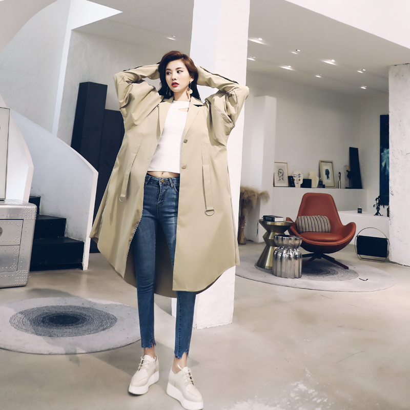 / 簡潔中長款風衣2018秋季新款慵懶bf港風收腰系帶寬松過膝外套大衣