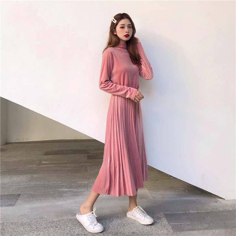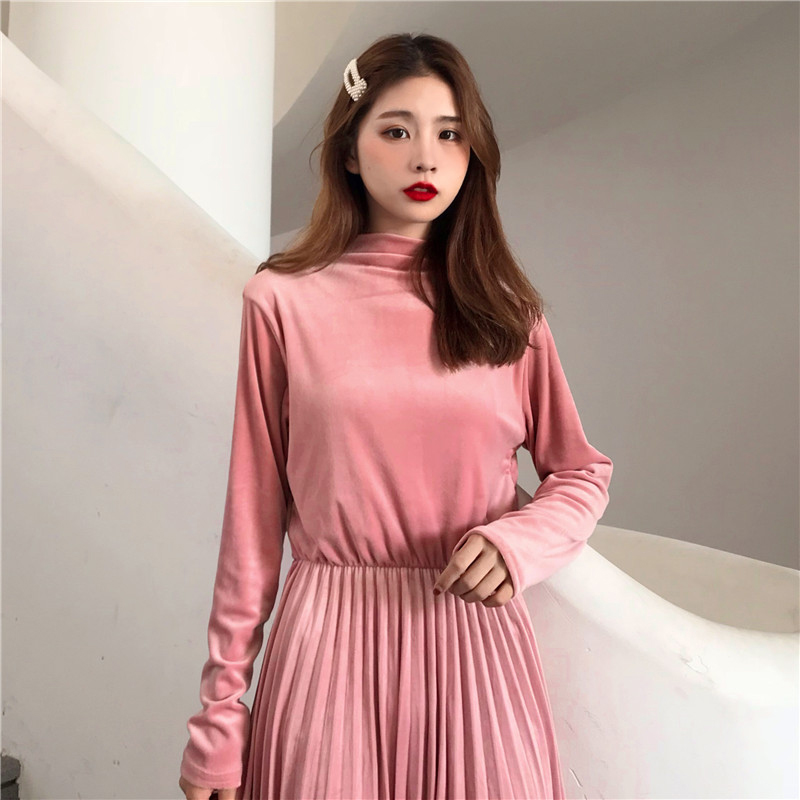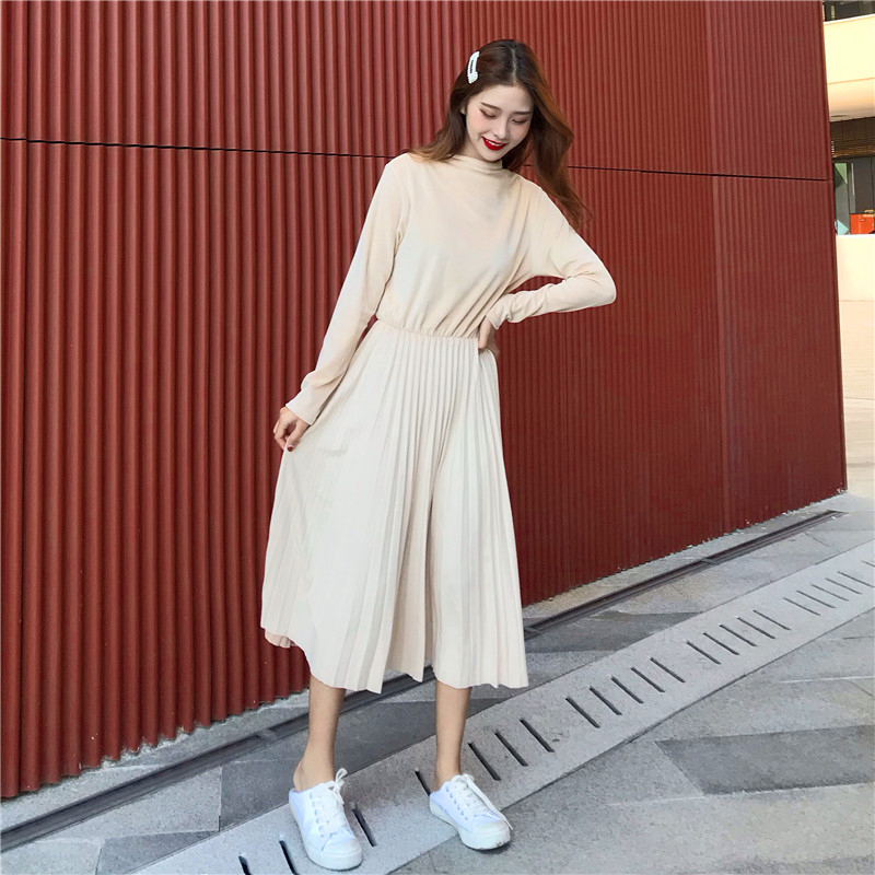法式少女桔梗裙秋冬裝2018新款eeg中長裙時尚百搭收腰百褶連衣裙