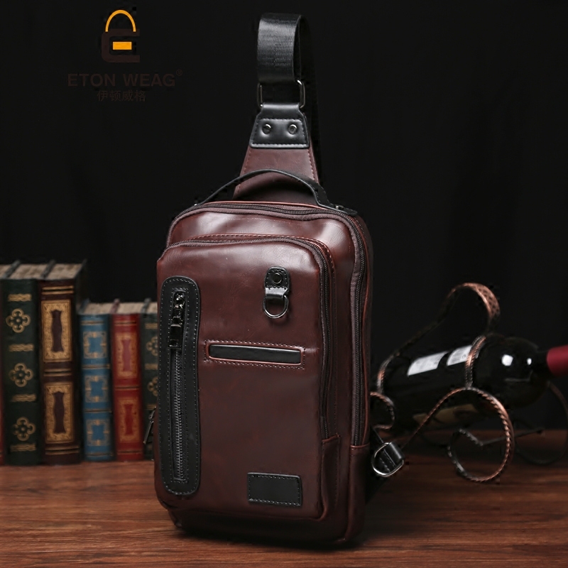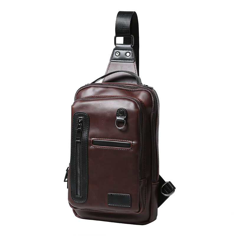/ 韓版新款男士胸包潮流撞色男士定型款瘋馬胸前包休閑單肩斜跨包