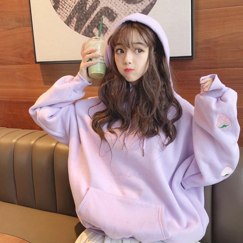 / 秋冬女裝韓版BF風寬松草莓刺繡連帽套頭加絨加厚超火衛衣上衣外套