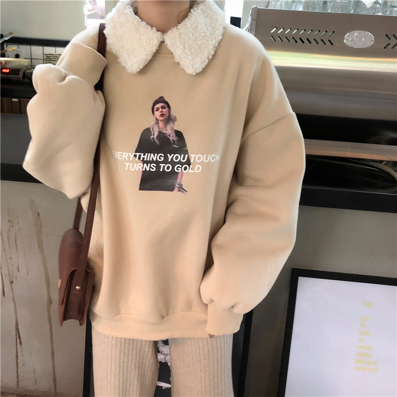 / 2018新款秋冬韓版寬松原宿風人物加絨加厚拼接仿羊羔毛衛衣外套女