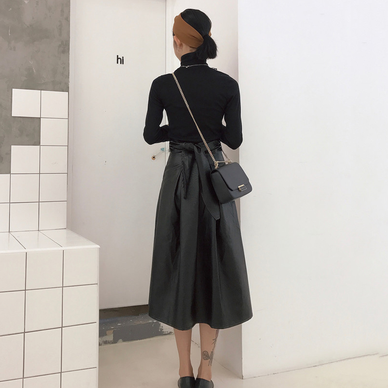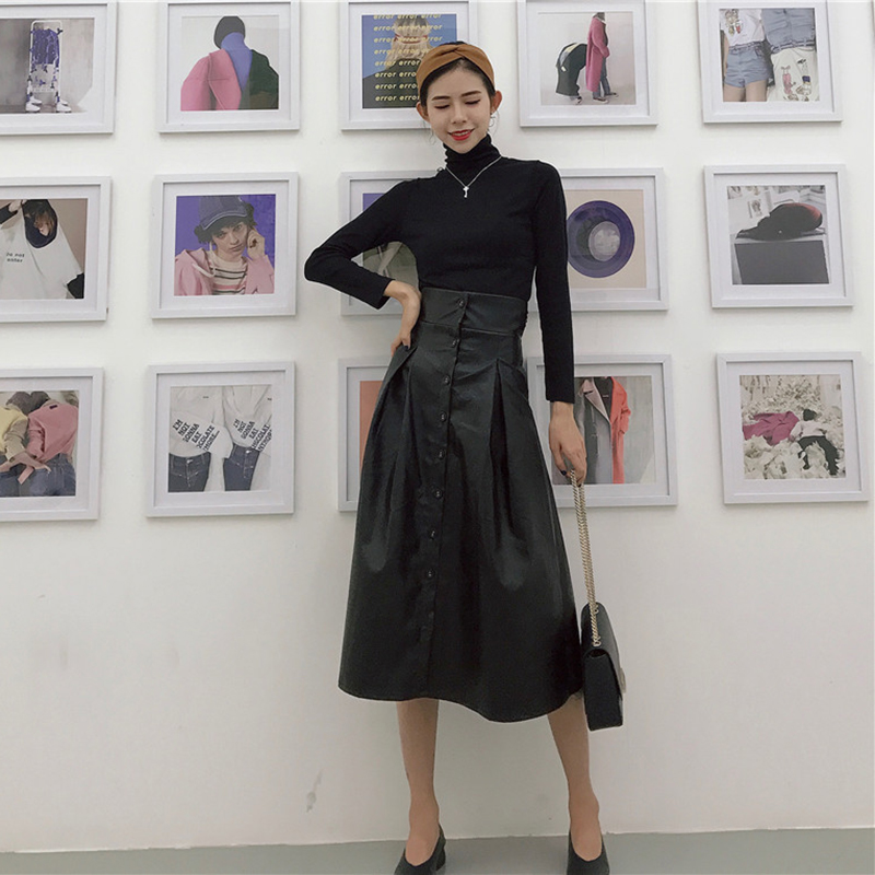 / 兩件套裝女秋新款高腰顯瘦單排扣PU皮半身裙子氣質修身長袖打底衫