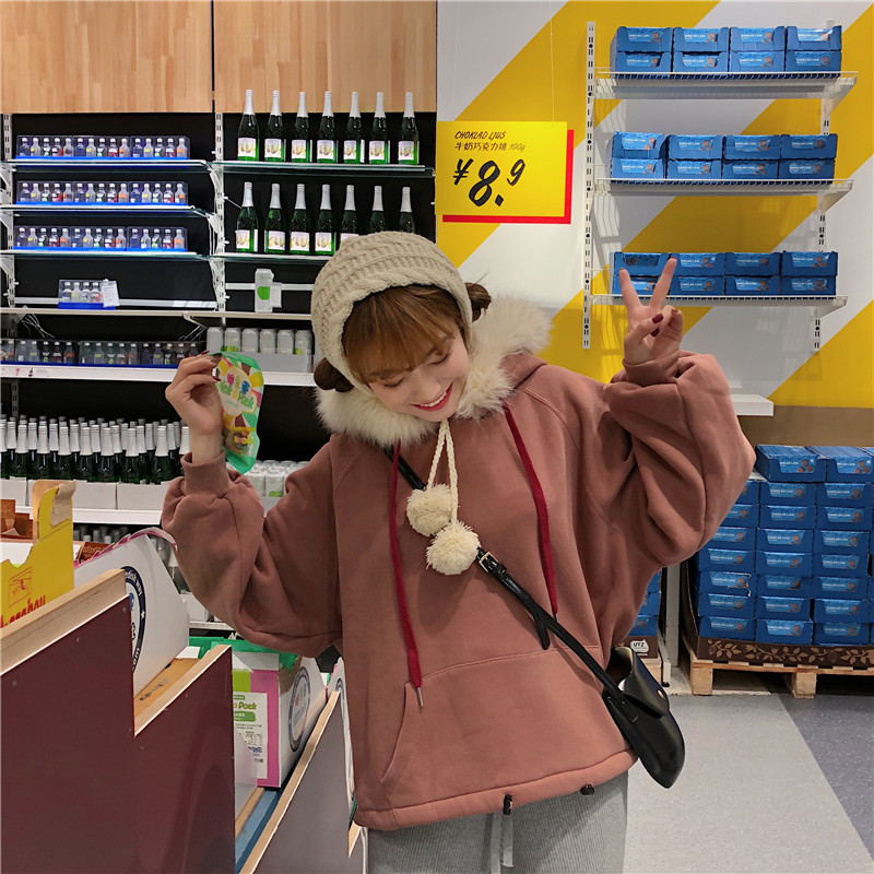 2018新款秋冬女裝韓版寬松毛領連帽加厚加絨套頭超火衛衣上衣外套