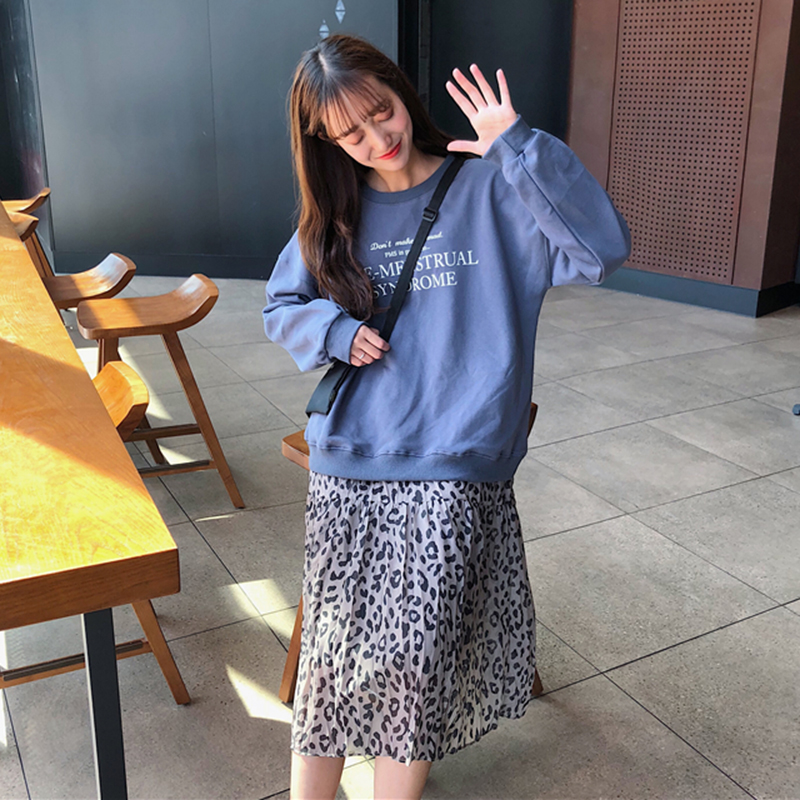/ 秋冬新款心機女套裝寬松字母印花衛衣氣質女神高腰豹紋雪紡半身裙