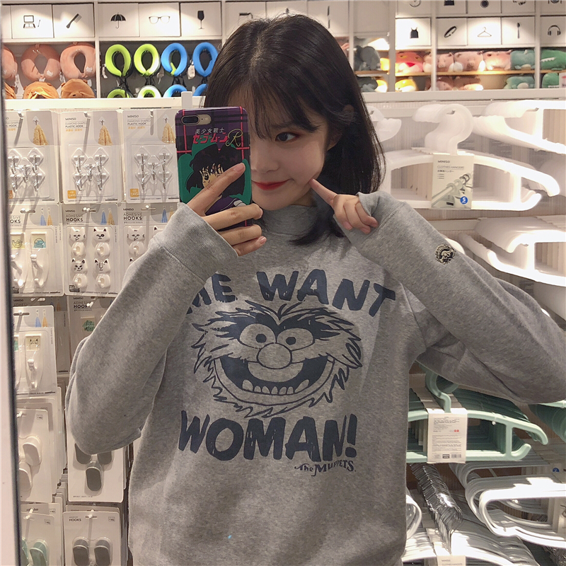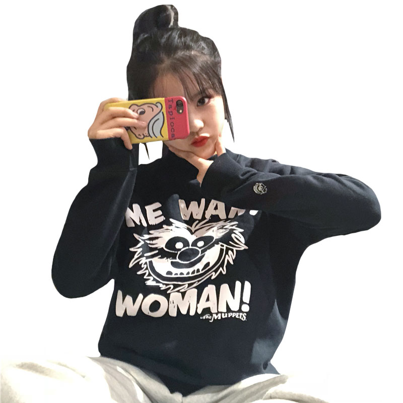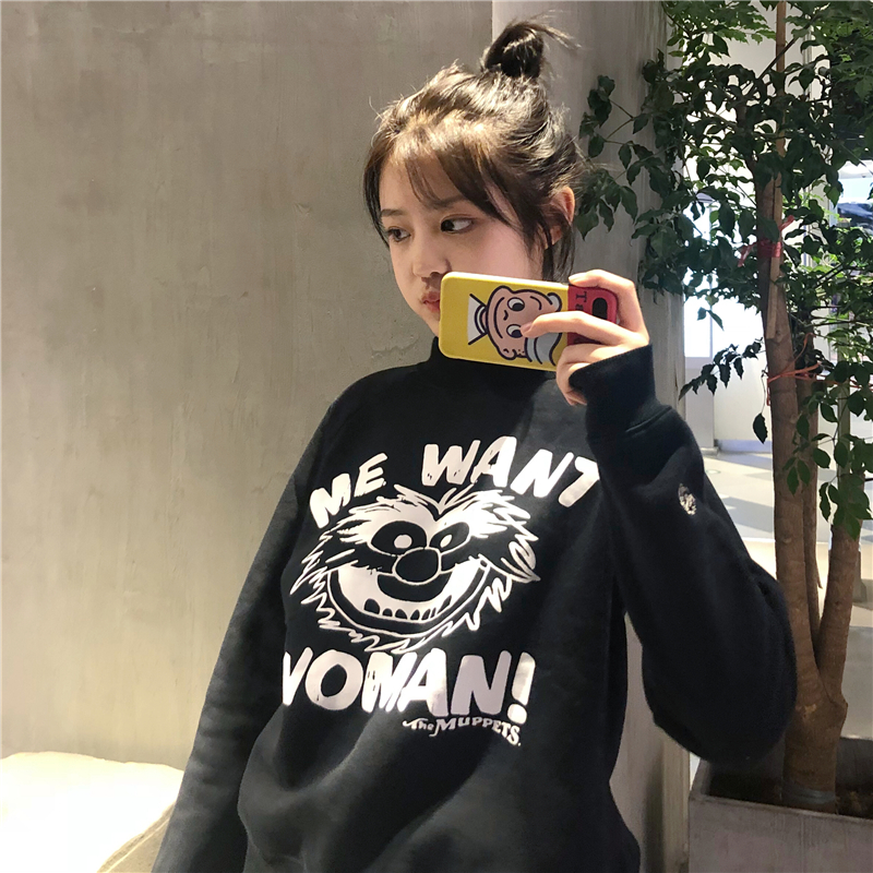 / 秋冬女裝韓版半高領原宿風寬松字母卡通加絨加厚套頭衛衣上衣外套