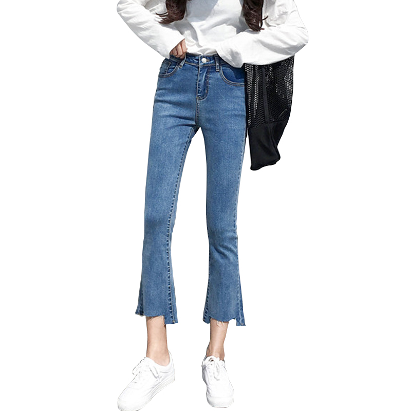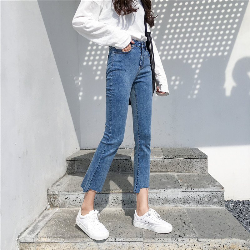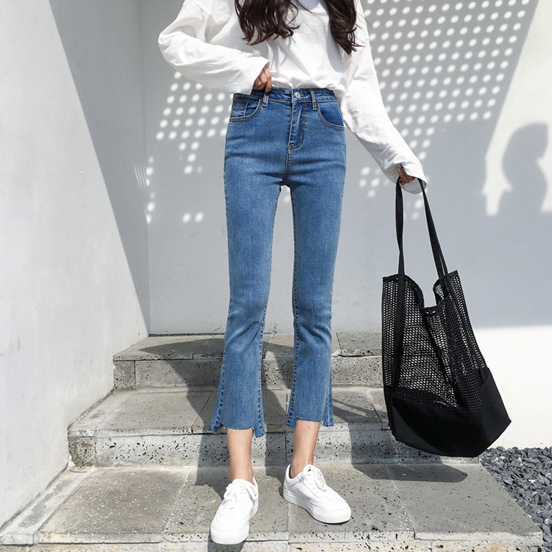 / 秋裝女裝韓版個性毛邊缺口修身顯瘦牛仔褲高腰九分褲微喇叭褲學生