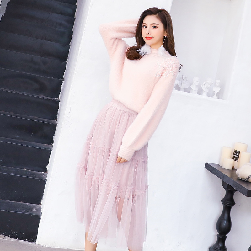 / 秋冬款套裝女2018新款針織上衣網紗半身裙兩件套淑女氣質中長款
