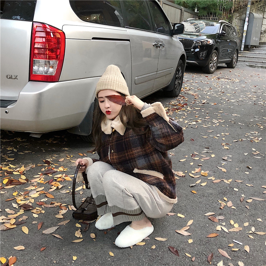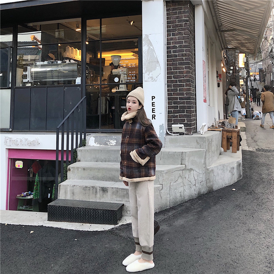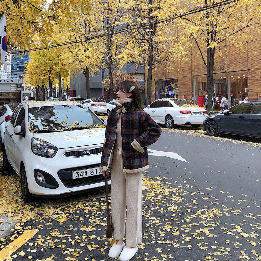 / 高領打底+復古加絨毛呢格子+系帶麻花針織褲套裝