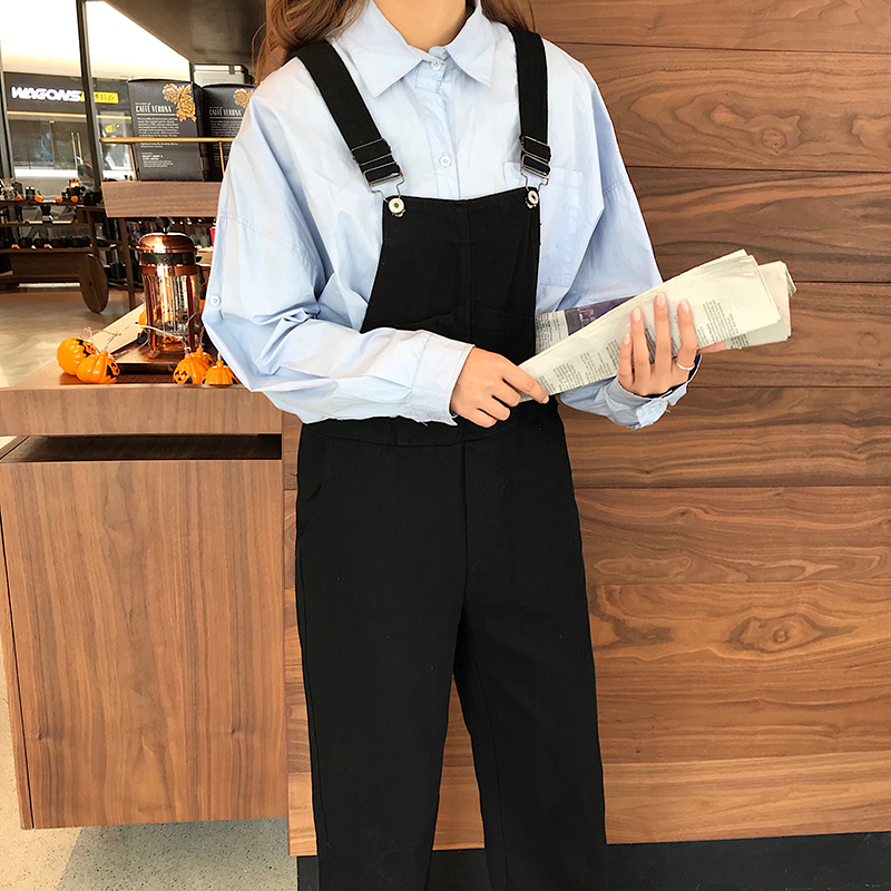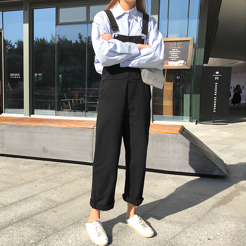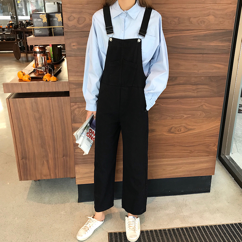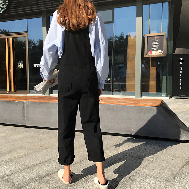 / 學生寬松闊腿牛仔背帶褲子女秋冬裝新款時尚黑色休閑初戀連體褲潮