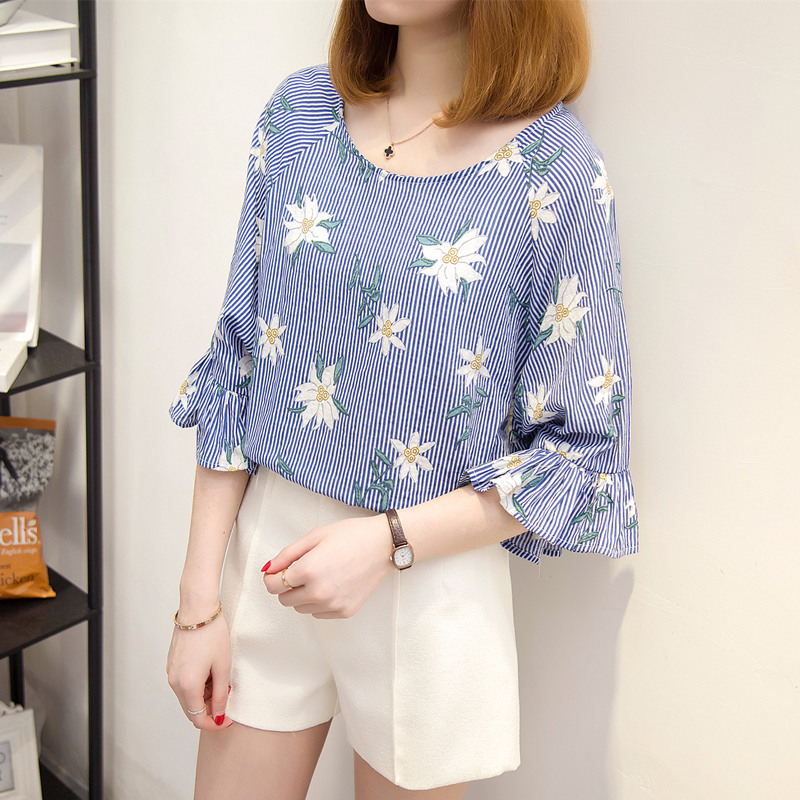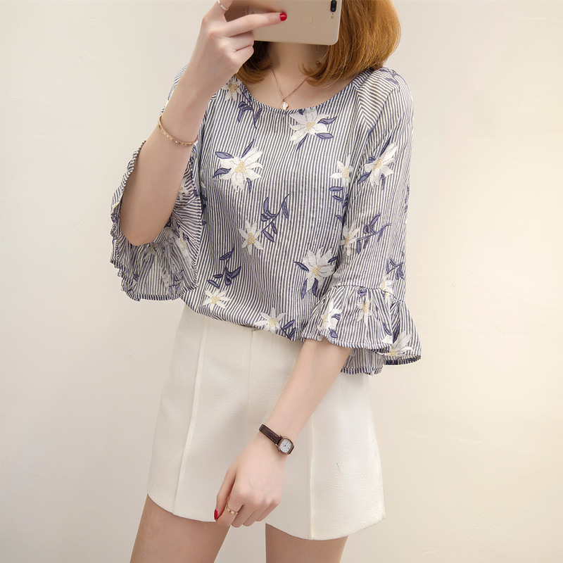 / 夏裝新款條紋襯衫女寬松韓風chic半袖襯衣女小清新上衣韓范