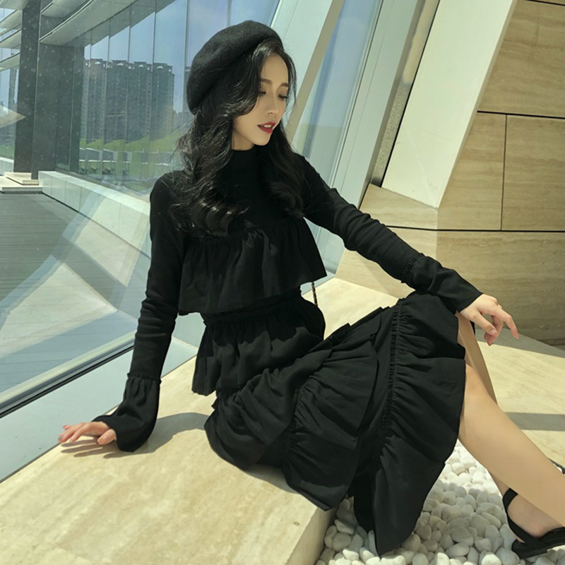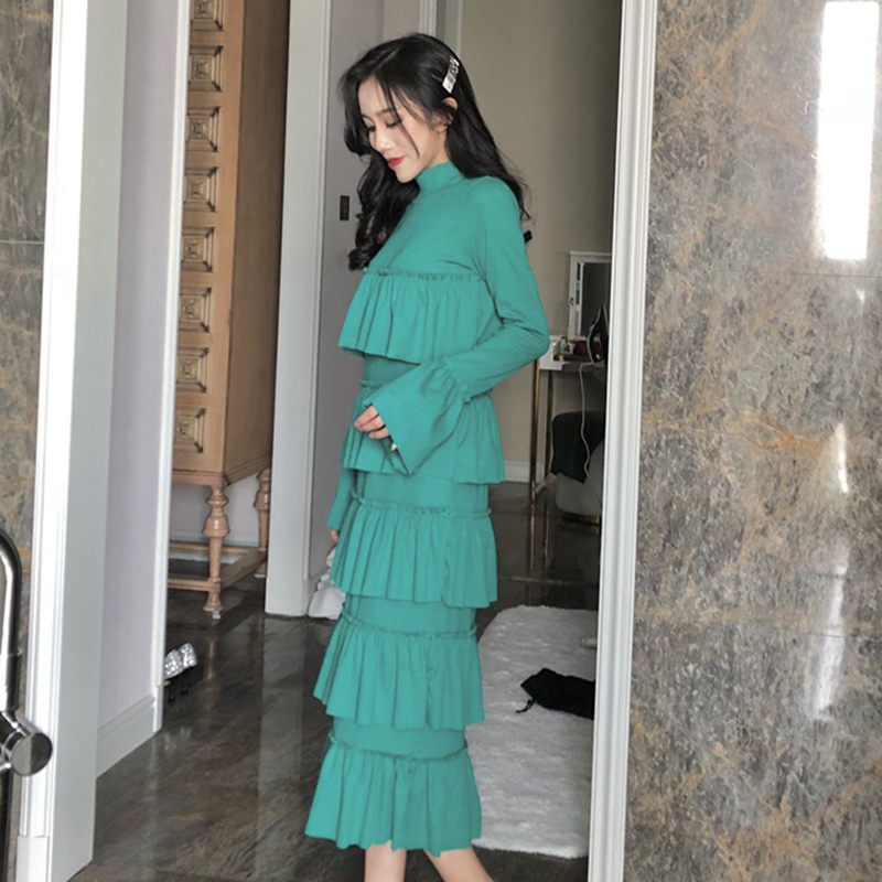 / 時尚半高領修身蛋糕裙女秋裝新款氣質喇叭長袖連衣裙學生中長裙子