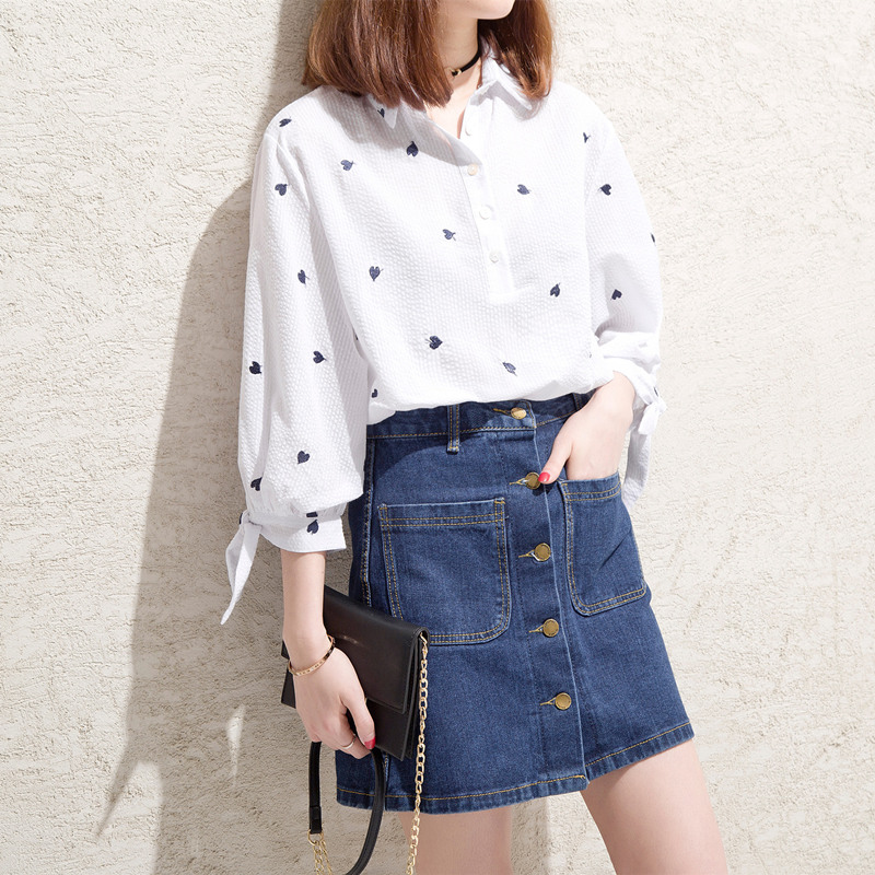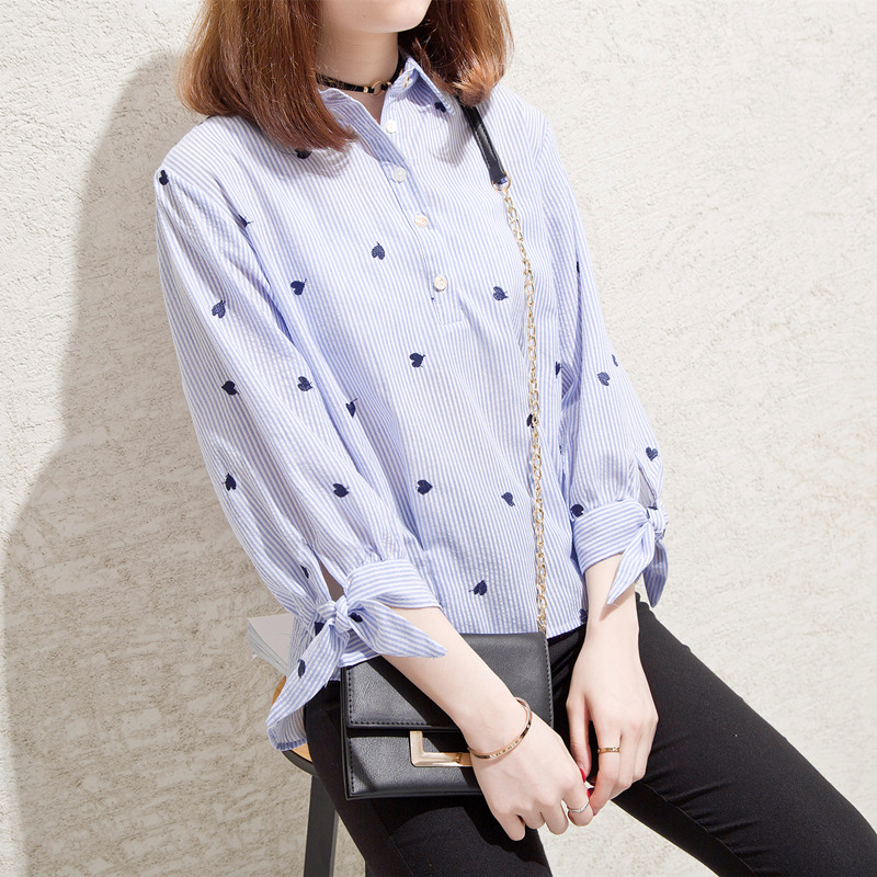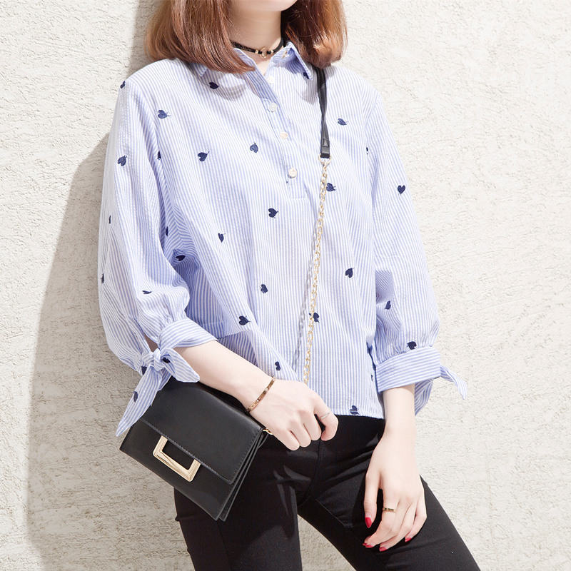 港味條紋襯衫女甜美上衣小清新韓范chic寬松白襯衣女夏裝新款