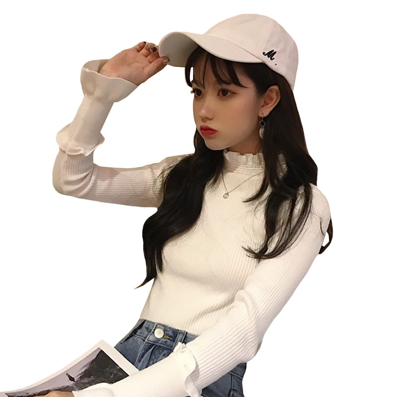 / 秋季韓版chic木耳邊半高領修身針織衫學生顯瘦長袖套頭毛衣上衣女