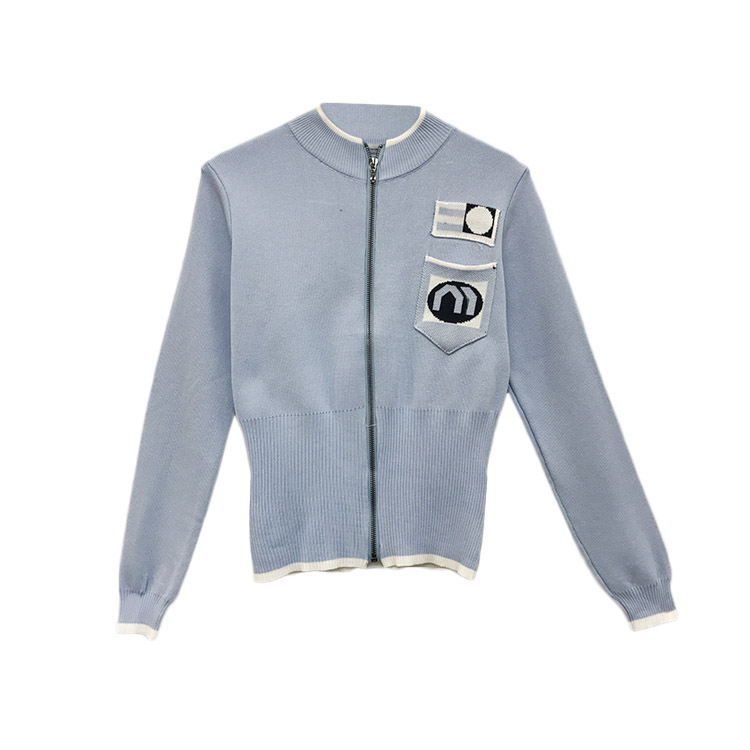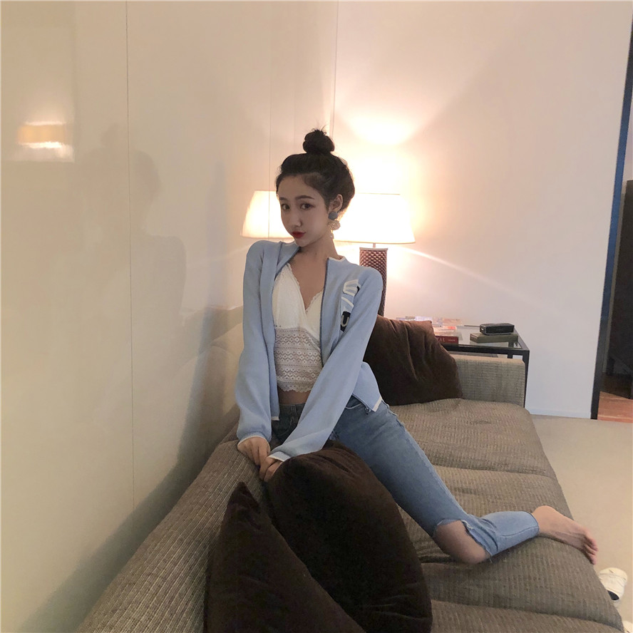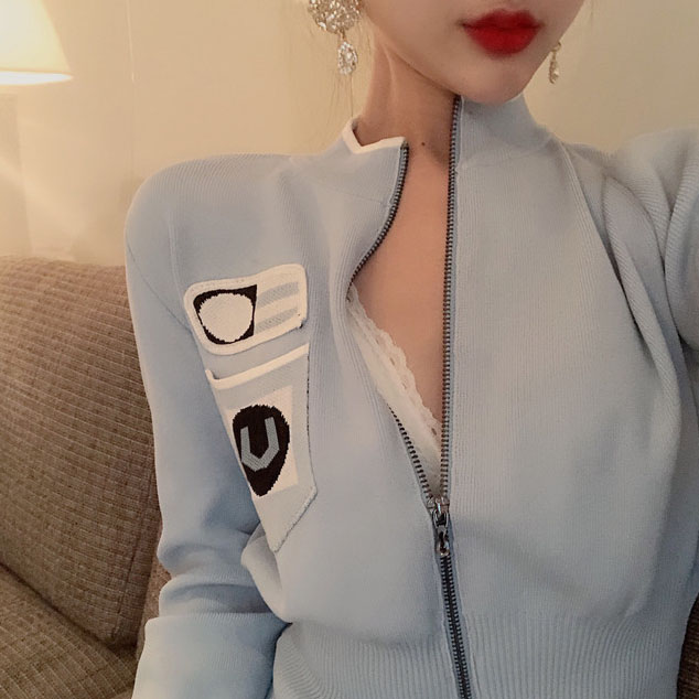 小香風馬卡藍針織衫開衫拉鏈毛衣短款外套女春秋2018新款韓版上衣