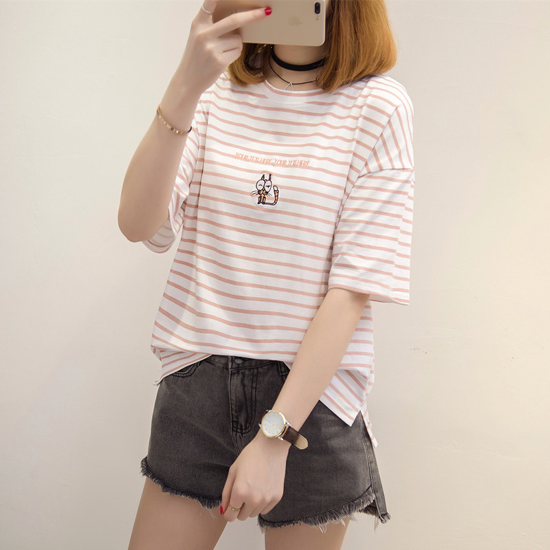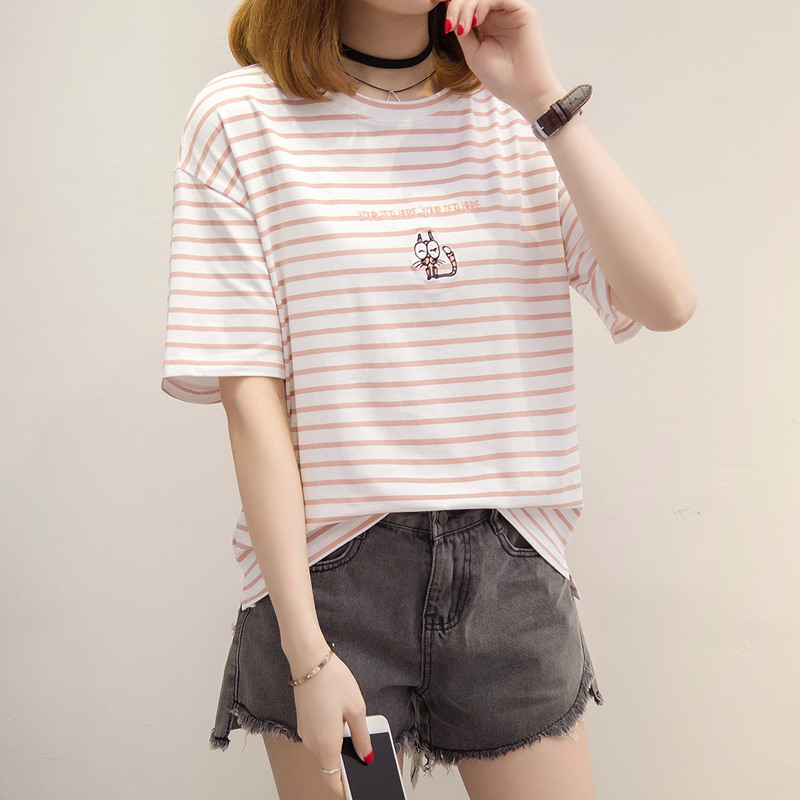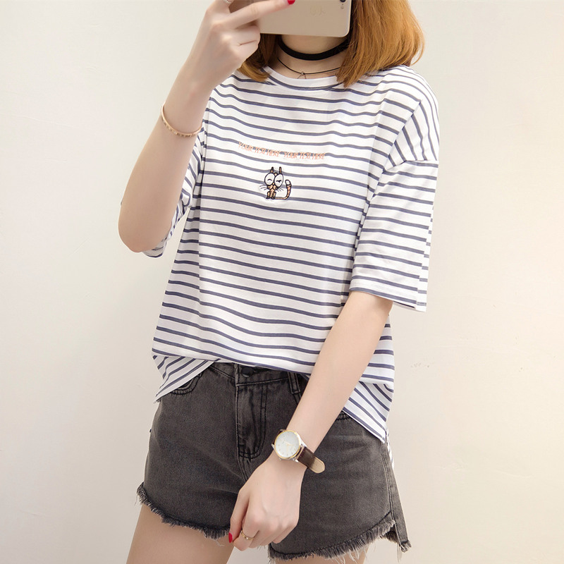 夏裝新款女小清新上衣條紋t恤女夏寬松刺繡體恤衫短袖衣服女