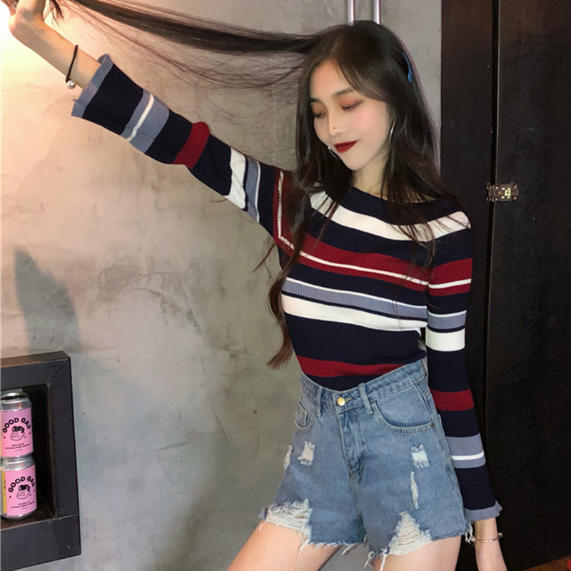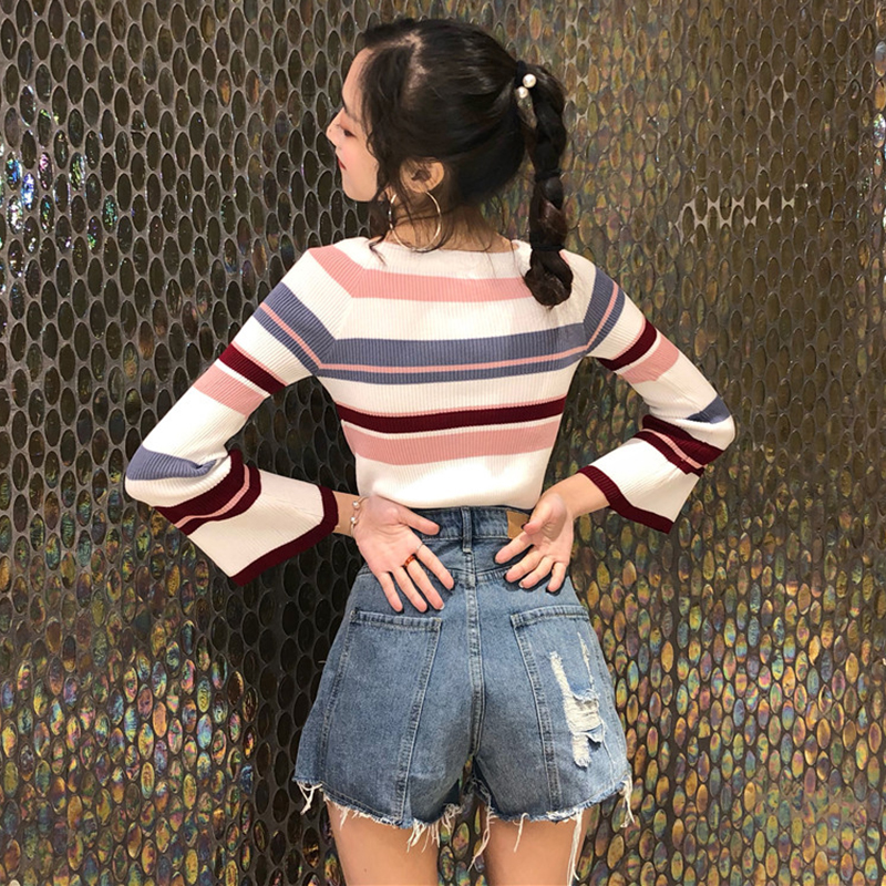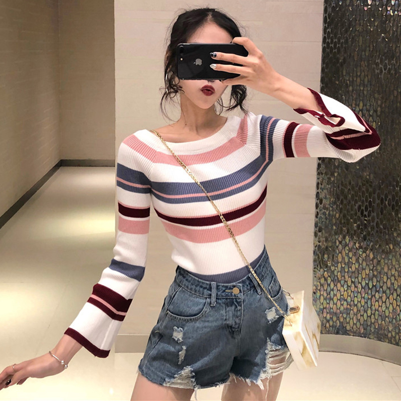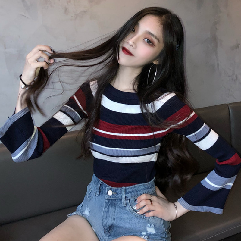 / 條紋針織衫女秋裝新款慵懶風時尚修身打底衫簡約氣質喇叭長袖上衣