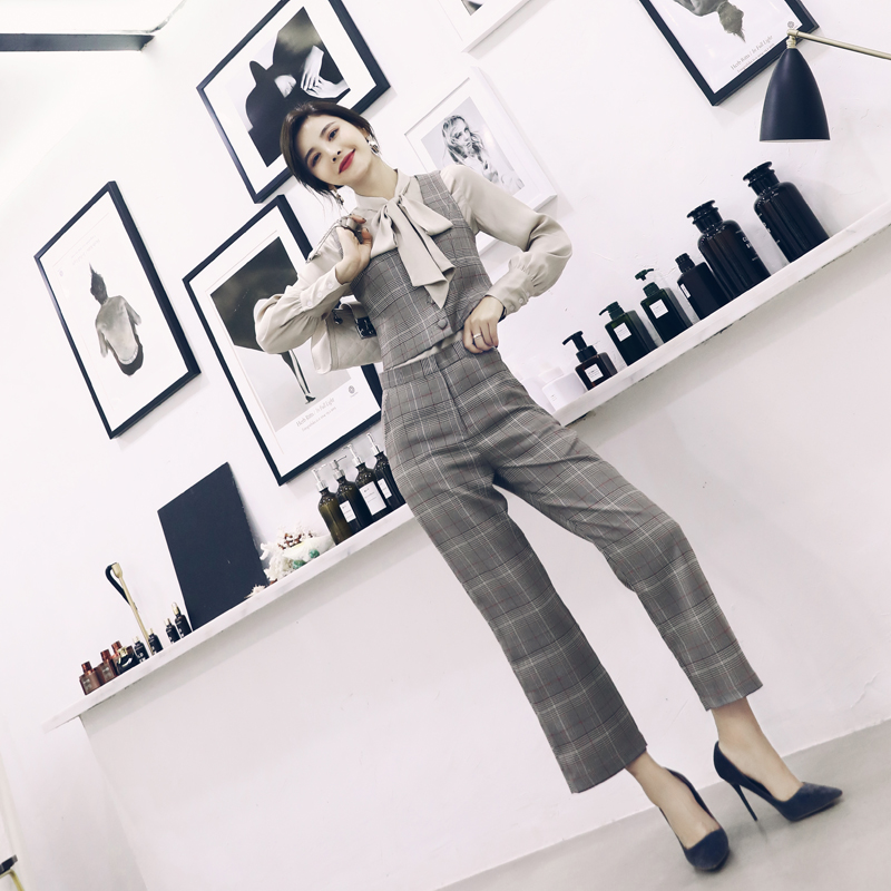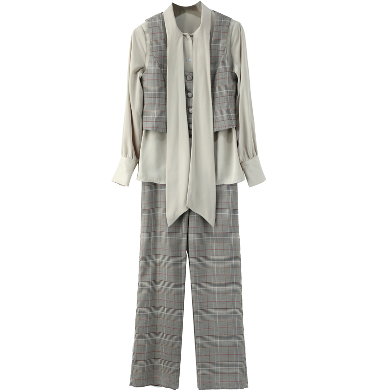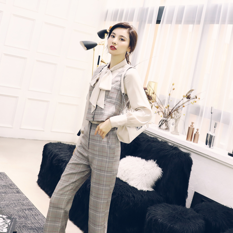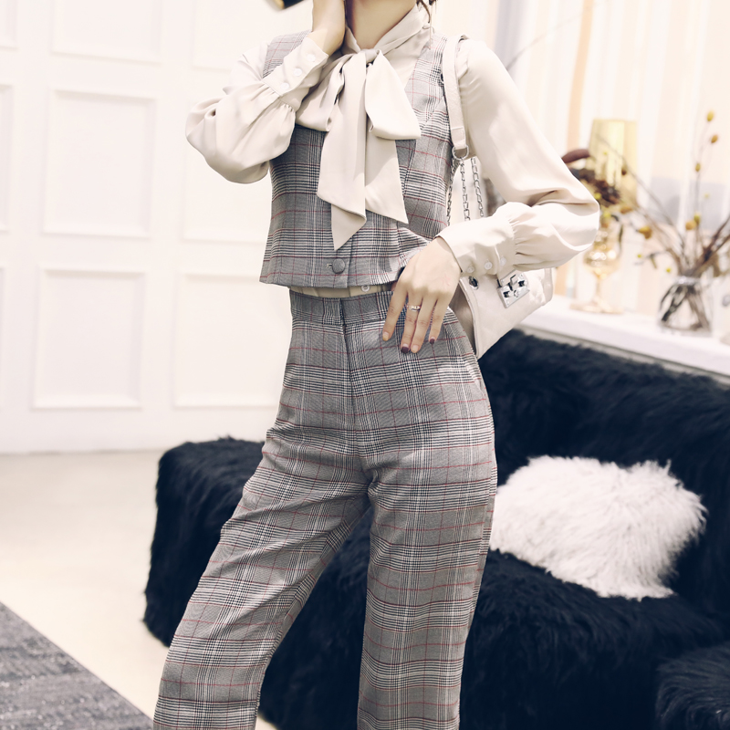 / 秋季套裝女時尚氣質名媛時髦襯衫格子西裝馬甲休閑長褲網紅三件套