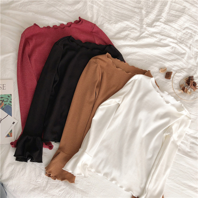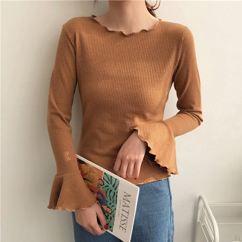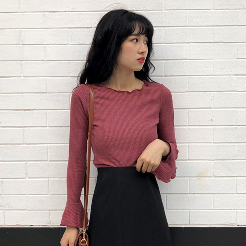 / 簡約喇叭長袖打底衫秋裝女2018新款修身純色短款上衣學生圓領T恤