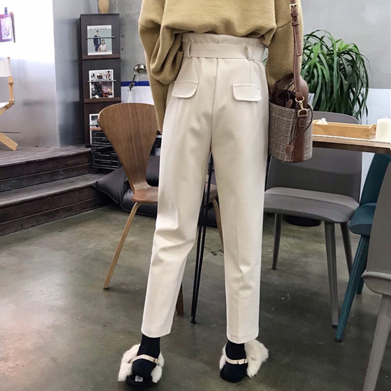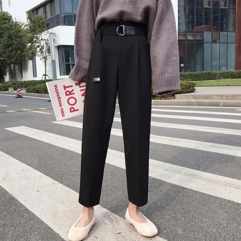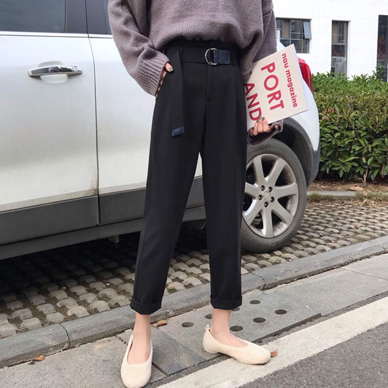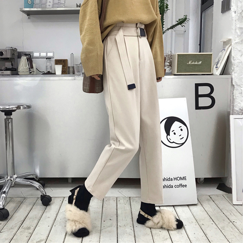 / 高腰顯瘦毛呢休閑褲子女秋冬裝新款學生黑色復古風寬松直筒西裝褲