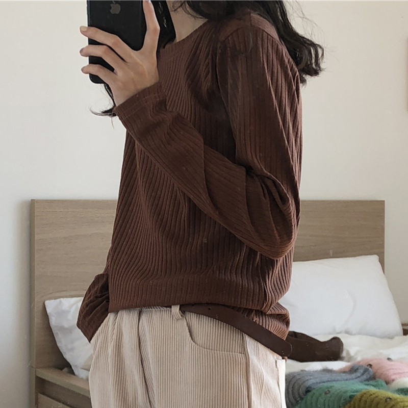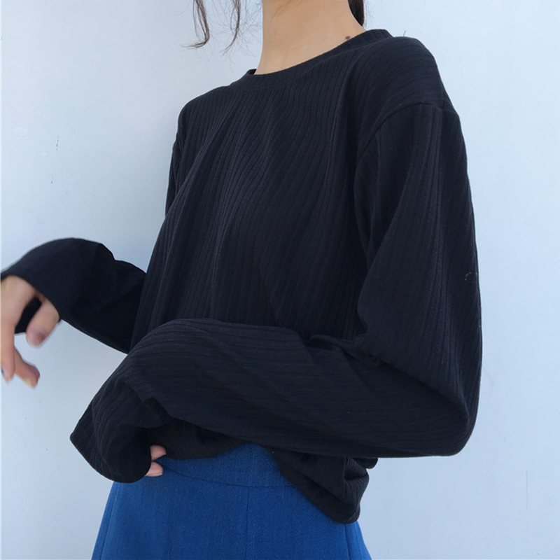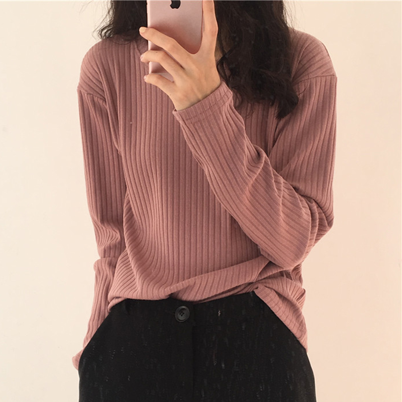 秋裝女2018新款韓版寬松坑條打底衫慵懶風純色基礎針織衫長袖上衣
