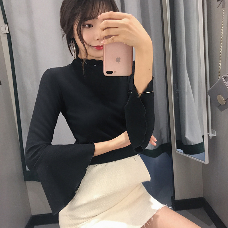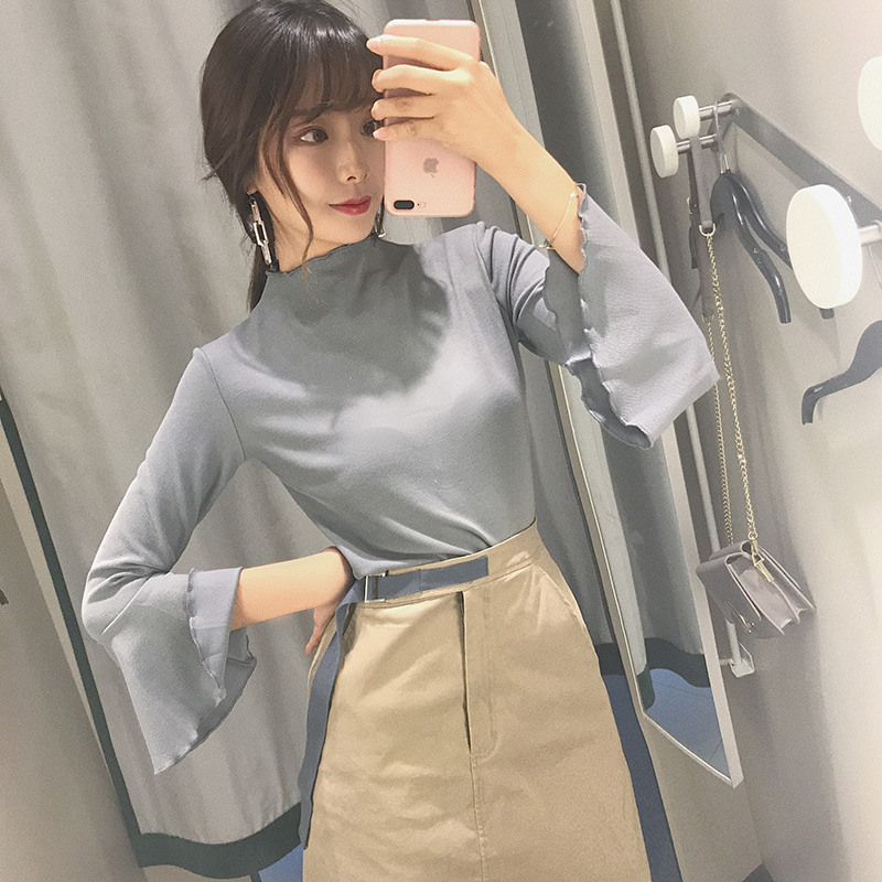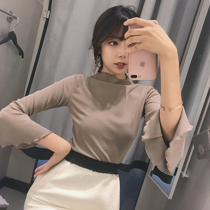 / 2018秋季新款韓范修身半高領打底衫百搭喇叭袖學生套頭t恤上衣女