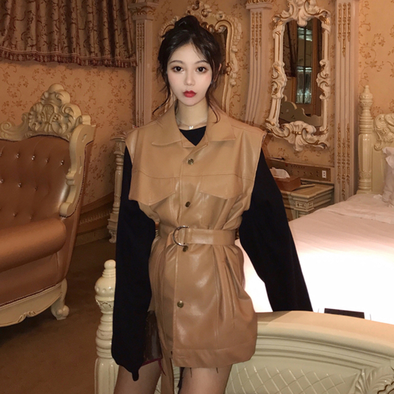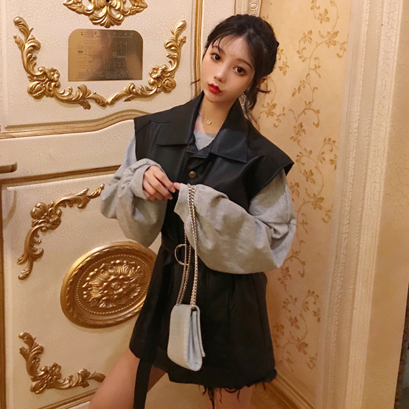 / 兩件套裝女秋新款收腰顯瘦機車帥氣PU皮夾克馬甲寬松長袖圓領衛衣