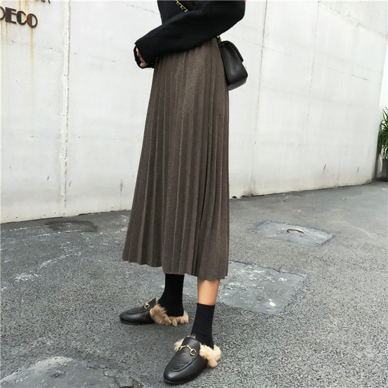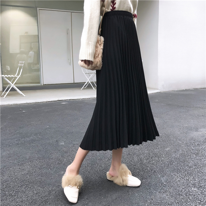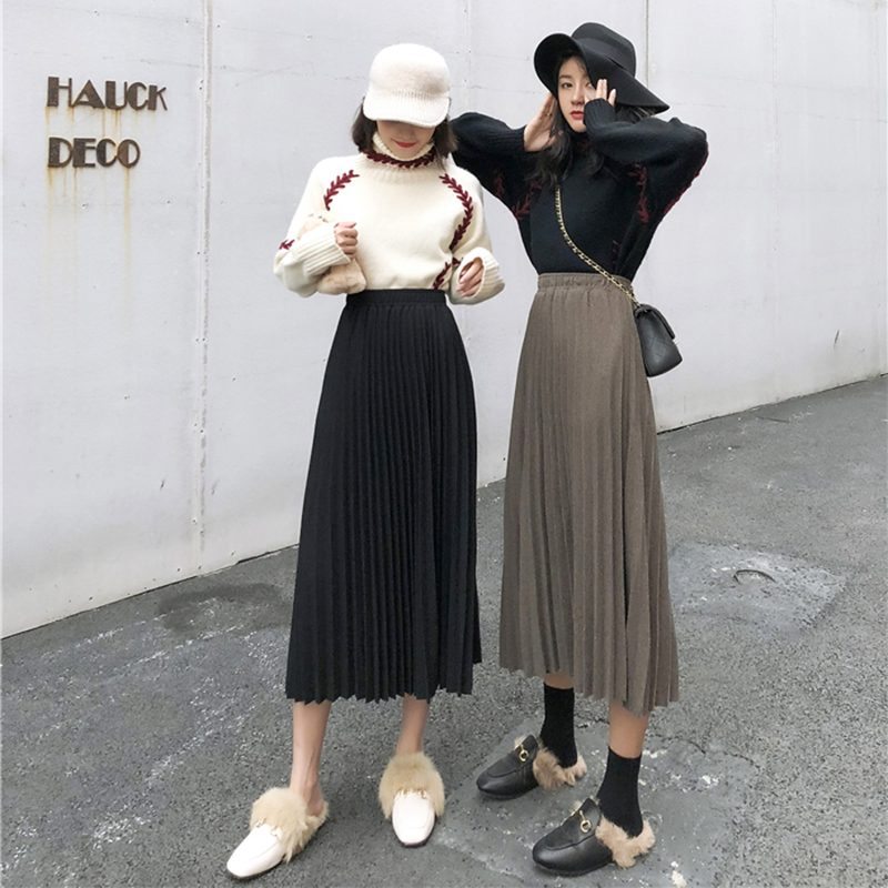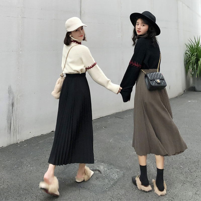 中長款A字裙女秋冬裝2018新款韓版氣質高腰顯瘦百褶裙針織半身裙